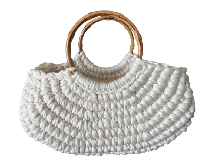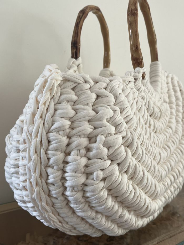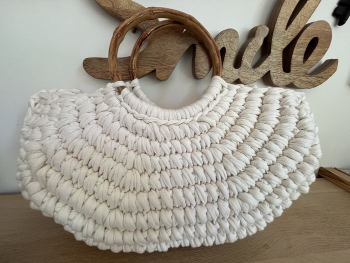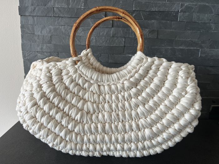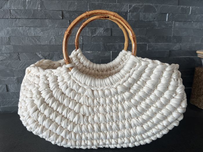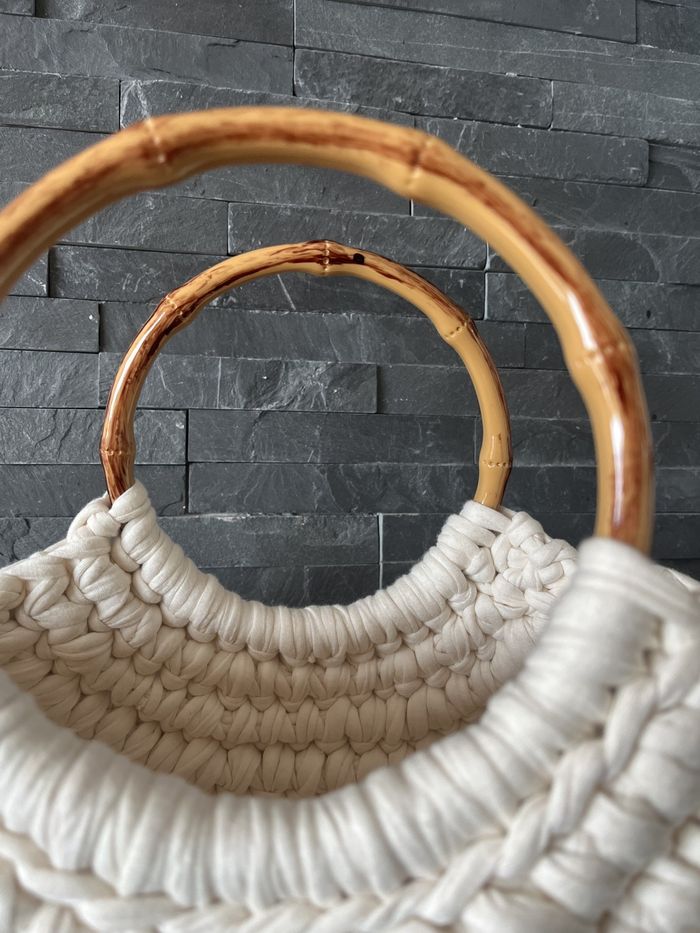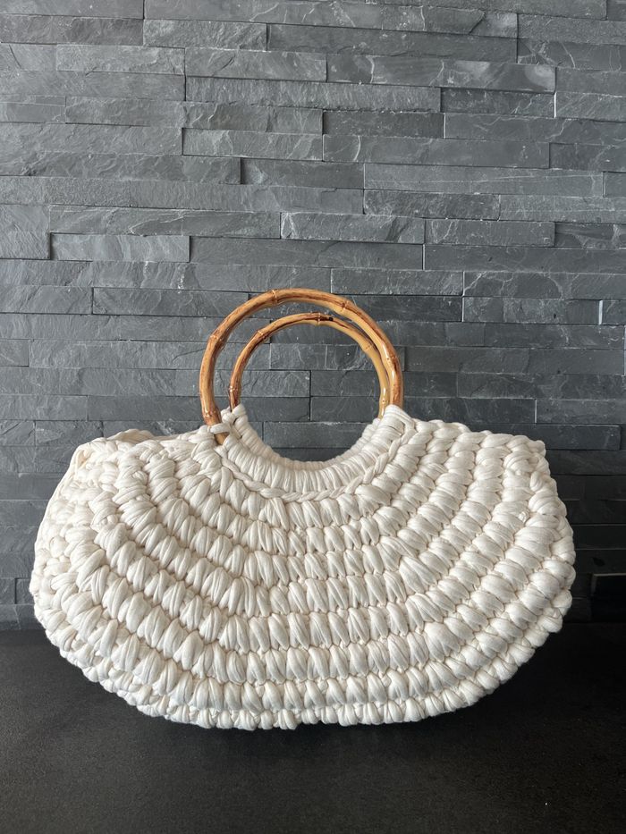 sac cabas tissé à la main avec du fil de coton 90% et élasthanne 10% blanc crème. poignées en bambou. Spacieux et pratique, ce sac tendance ajoutera une touche de style et d'originalité à toutes vos tenues. le compagnon idéal de votre été ! dimension 39 cm x 23 cm.