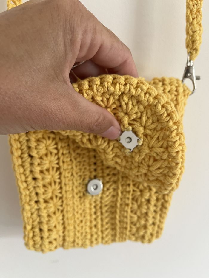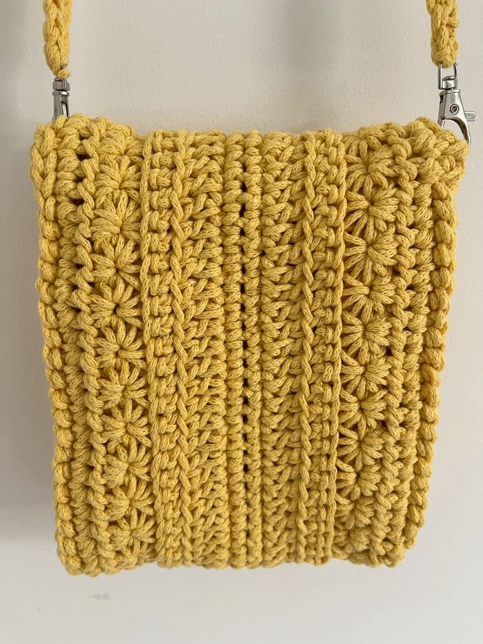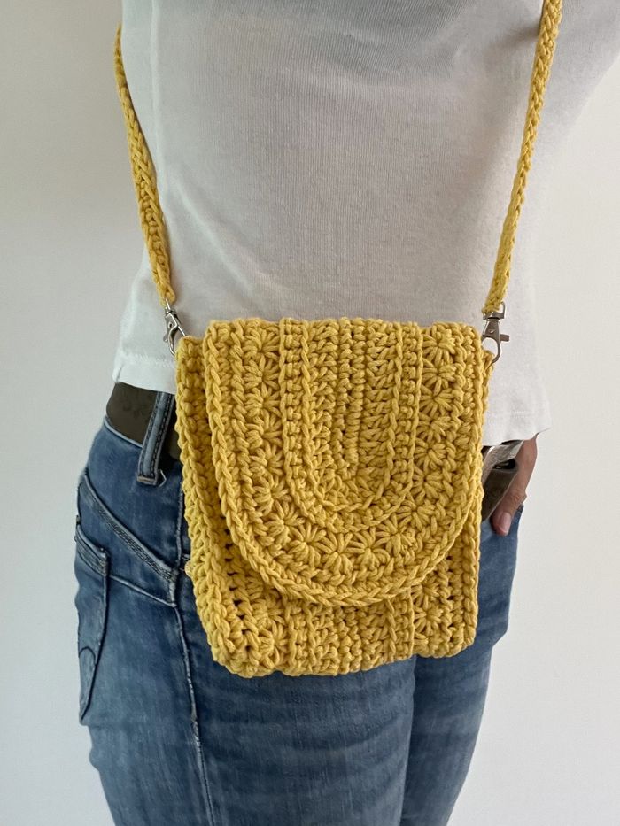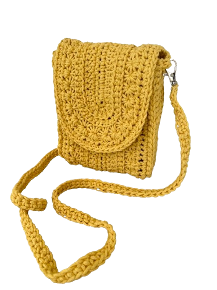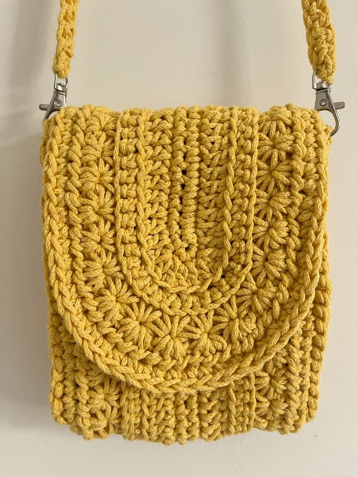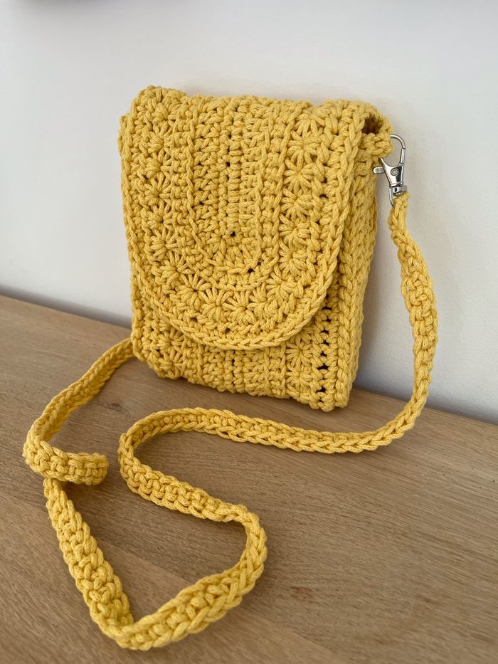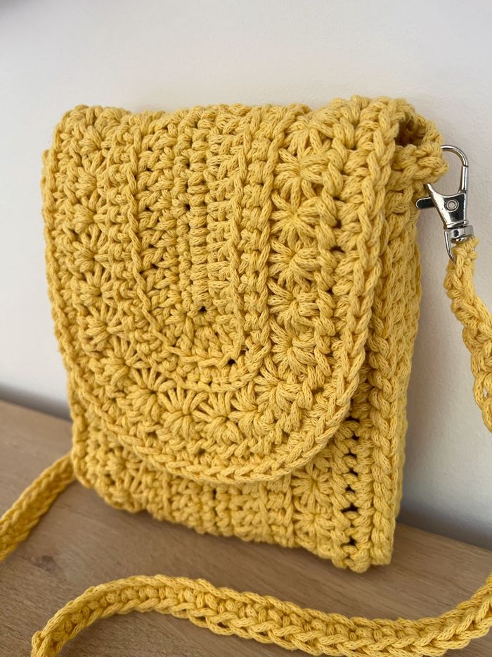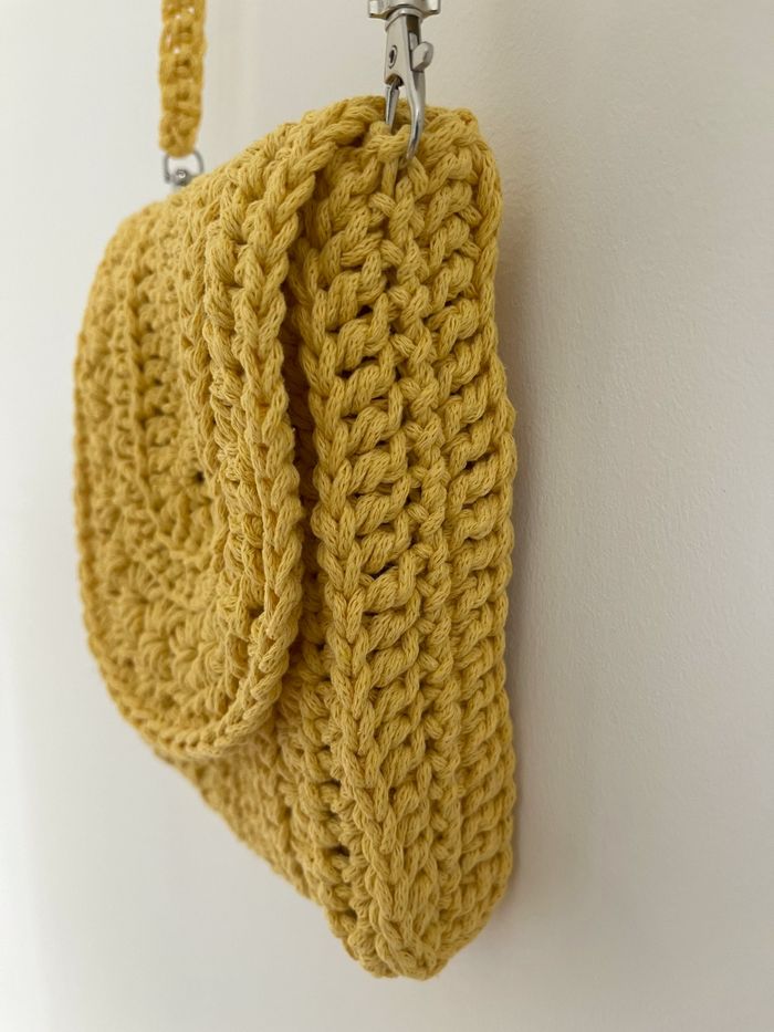 sac pochette bandoulière fait main au crochet bohème jaune moutarde