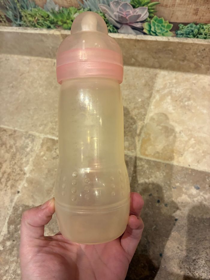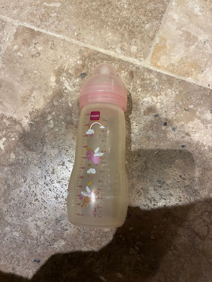 Biberon Mam. Le plastique a jauni à cause de la soupe. Vendu sans tétine.