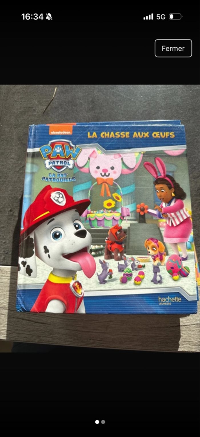 Livre pat patrouille La chasse aux œufs Voir photo livre abîmé et écrit sur l’intérieur de la couverture mais ne gêne pas à la lecture