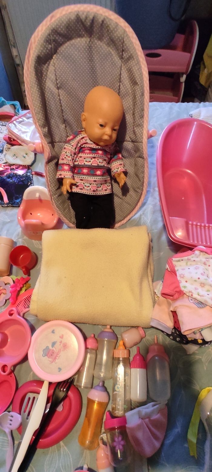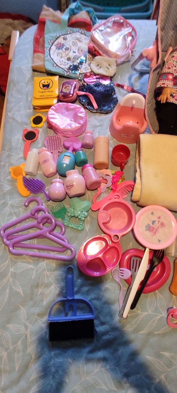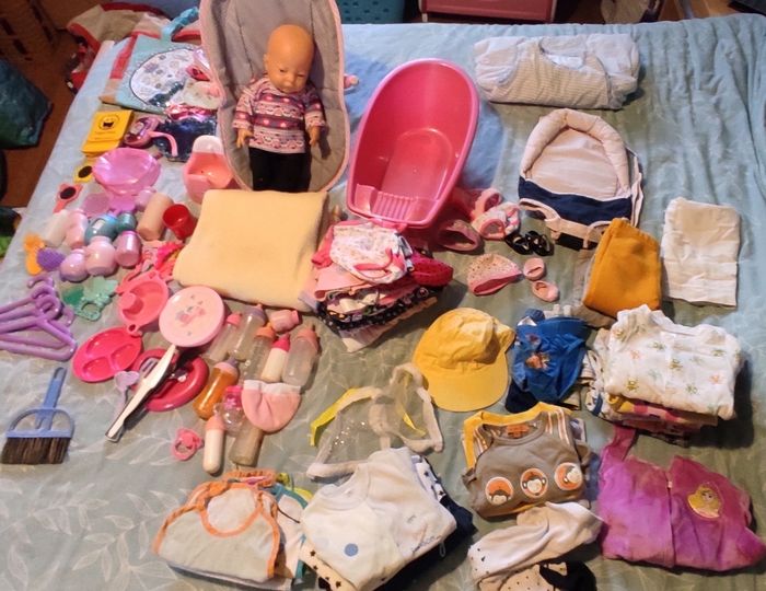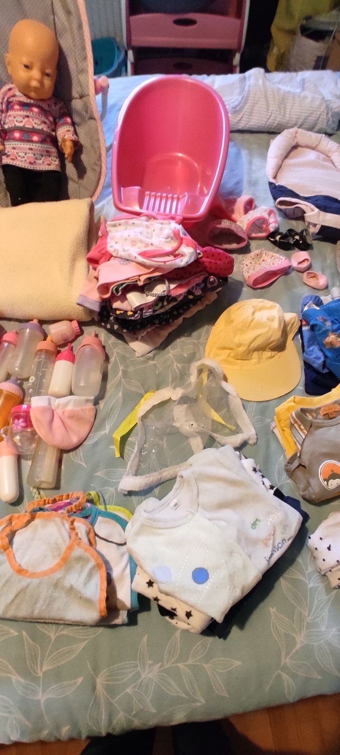 Je vends ce lot d'accesoires et une poupée. Baignoire, transat, porte bébé, couverture, gigoteuse, biberons, vaisselles, bavoirs et vêtements