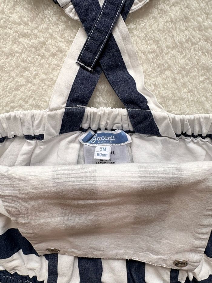 Barboteuse à rayures de la marque Jacadi, taille 3 mois (60cm). Facile à enfiler et pratique pour le change grâce à sa boutonnière à l’entre jambes. Convient parfaitement pour l’été. ☀️ Très bon état. ✨ #jacadi#barboteuse#été#bébé#fille#3mois