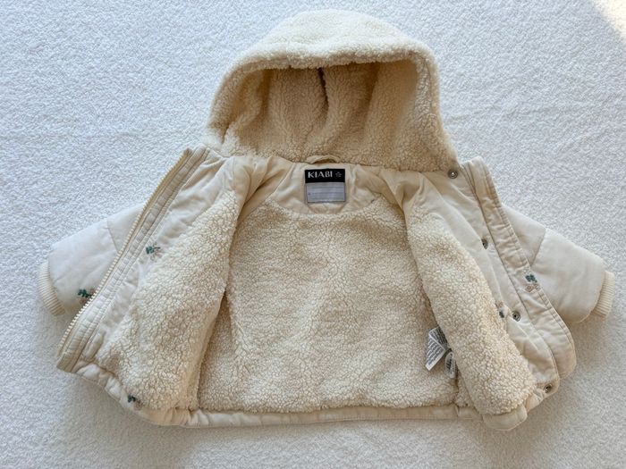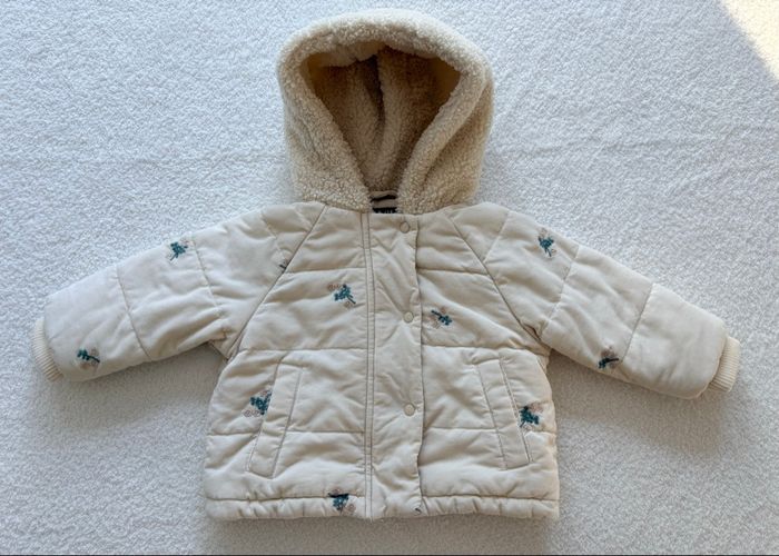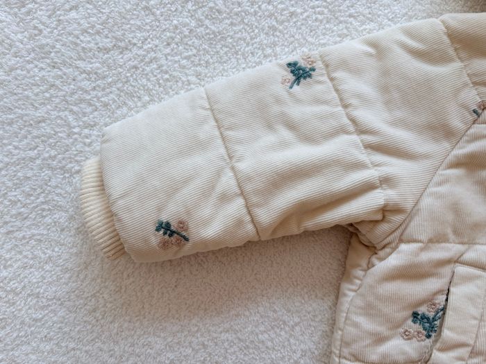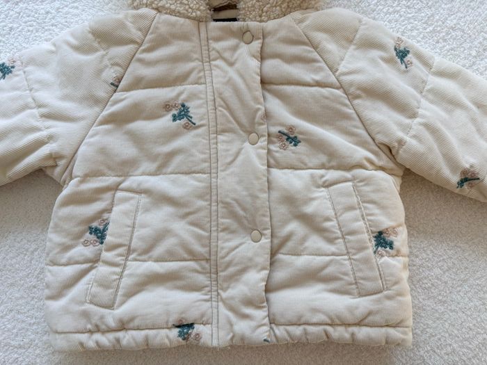 Manteau de la marque Kiabi, taille 6 mois (68 cm). Manteau rembourré de la collection actuelle, extérieur en velours côtelé et aux motifs fleurie, intérieur et capuche en moumoute. Convient parfaitement pour l’hiver. ❄️ Très bon état, porté seulement deux fois.✨ #manteau#kiabi#bébé#fille#hiver#6mois