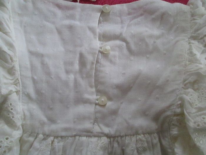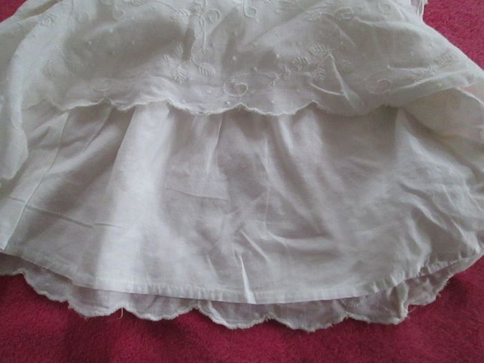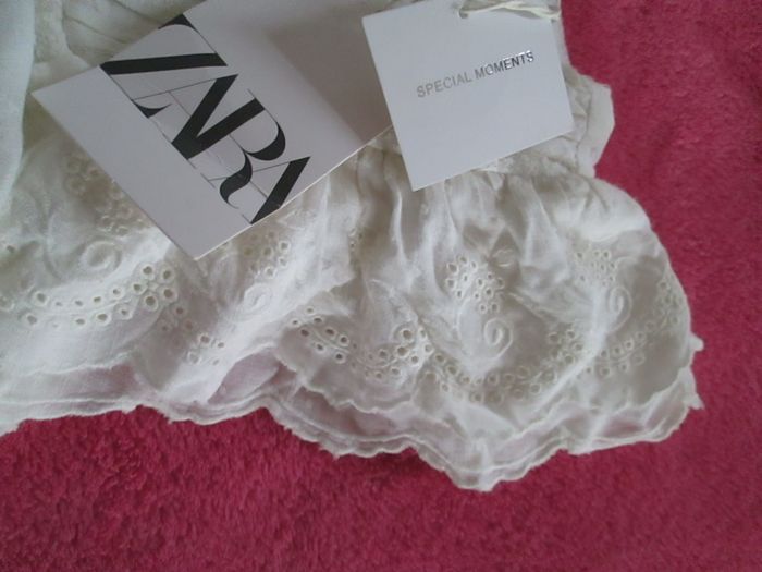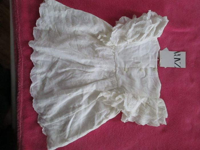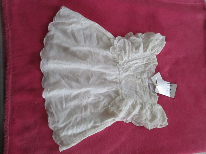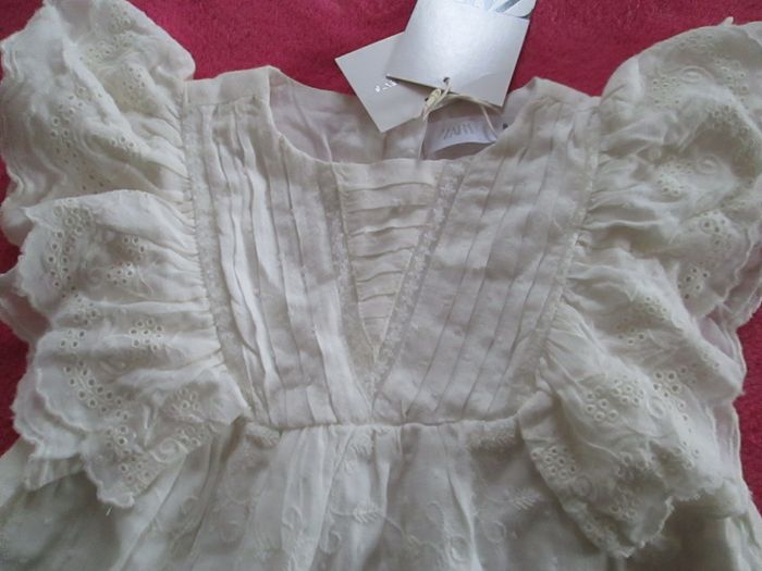 Vends robe Zara couleur ivoire avec dentelle. Volants dentelle sur les épaules. Partie inférieure de la robe toute rebrodée. S'attache avec des boutons dans le dos. Entièrement doublée. 100 % coton. Taille 9/12 mois. Neuve, vendue avec étiquette. Pour plus de choix, allez consulter mes autres annonces.