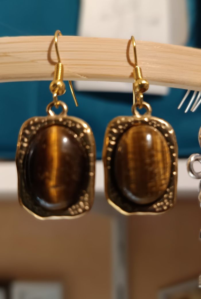 Boucle d' oreille couleur dorée avec Pierre oeil de tigre .
