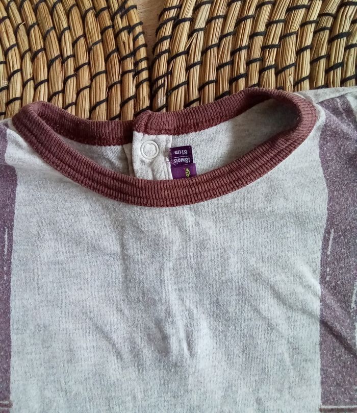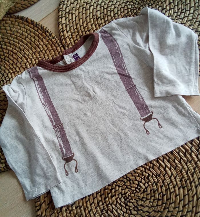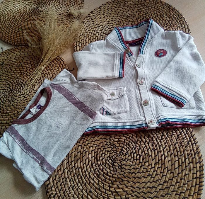 Ensemble composé de : 🐱 1 gilet beige encolure en V avec 2 poches 🐱 1 tee shirt manches longues assorti Avec les lavages, le marron a un peu passé 🐱 109% coton 🐱 Taille 18 mois