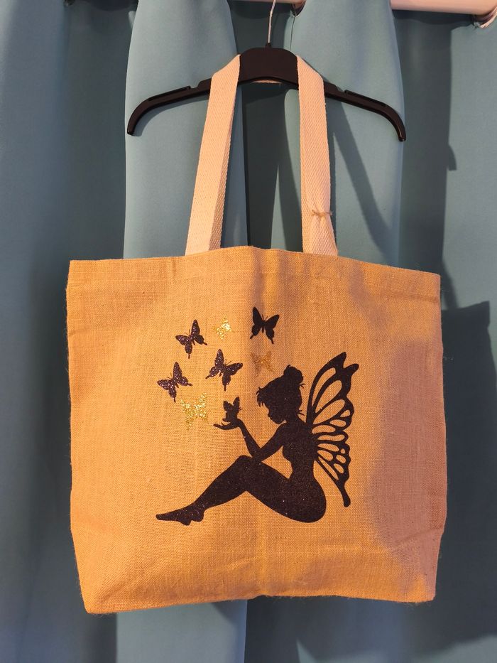 Sac en toile de jute fée Possibilité de personnaliser avec un prénom ou une phrase. Hauteur 38 cm et 64 cm avec les hanches. Largeur 49 cm. Possibilité d'en faire à la demande avec un autre dessin.
