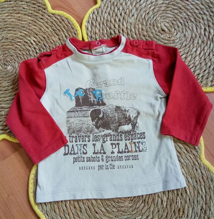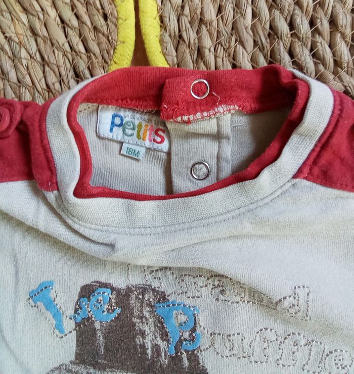 Ensemble composé de : 🐱 1 pantalon marron imprimé avec poches Lien de resserrage à la taille Jambes avec élastique dans le bas et boutons pressions 100% coton 🐱 1 tee shirt manches longues imprimé Boutons pressions dans le dos 1 mini accroc dans le bas consolidé (voir dernière photo) 🐱 Taille 18 mois