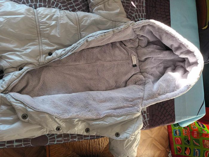 combinaison 6 mois couleur gris mixte pieds integres qui peuvent s enlever avec des pressions mais pas de gants pressions et fermeture eclair jusqu en bas capuche integree qui ne s enleve pas marque jean bourget polaire a l interieur tres bon etat