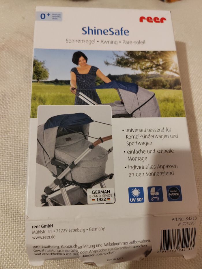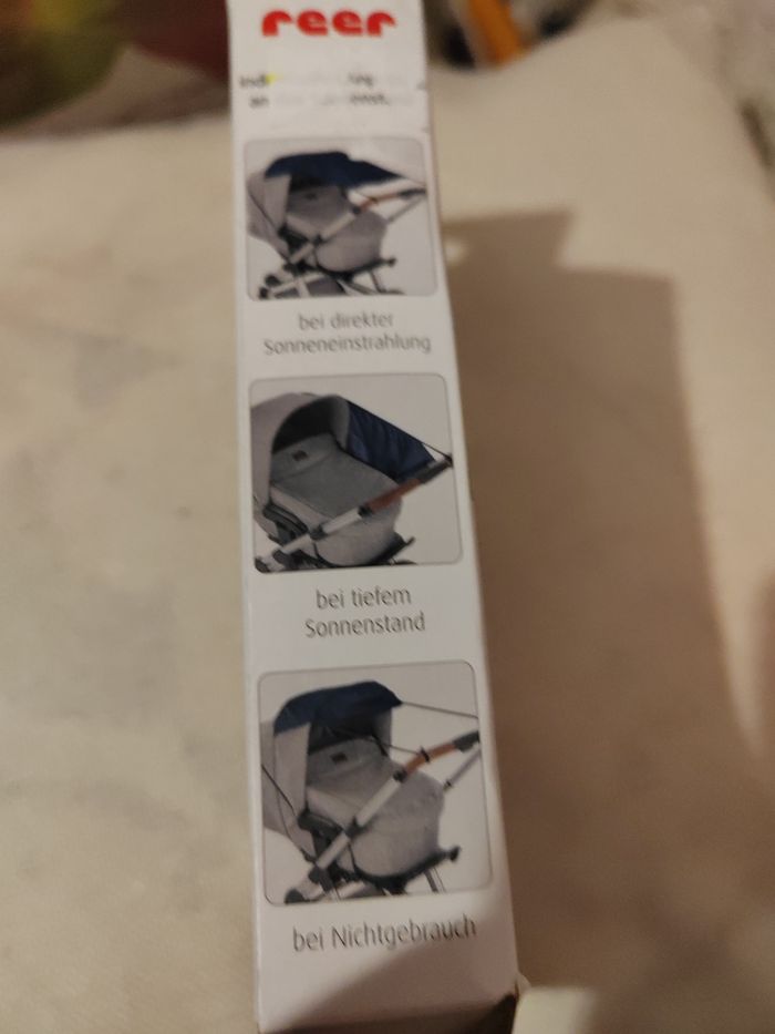 Protection soleil neuf Description internet Fournit de l'ombre et protège contre les coups de soleil (UPF: 50+) Adaptation confortable à la position du soleil protège contre le vent latéral et la bruine légère Montage facile et rapide Facile à ranger Dimensions env. 34-52 cm x 72 cm Lavable en machine
