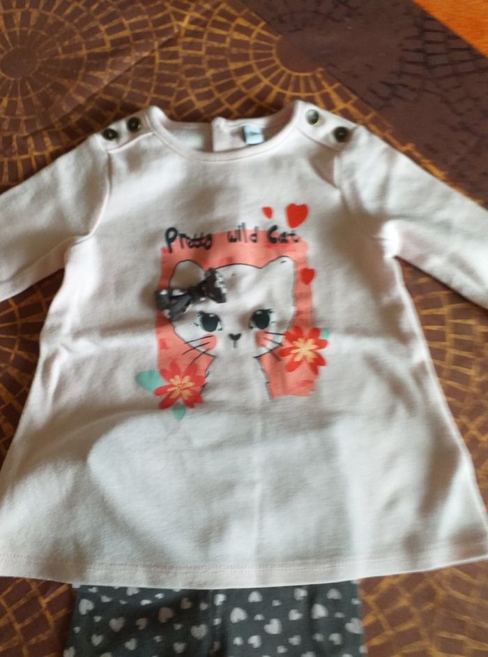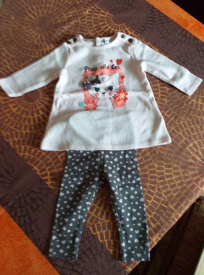 ensemble pantalon et tee shirt fille 6 mois couleur rose et motif chat pur le tee shirt couleur gris motif coeurs pour le pantalon sans marque tres bon etat