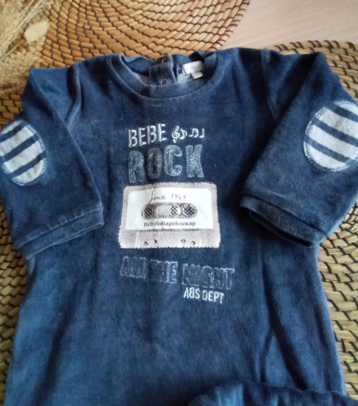 🐱 Babygro en velours bleu imprimé 🐱 Quelques craquelures sur le motif central 🐱 76% coton 24% polyester 🐱 Taille 18 mois