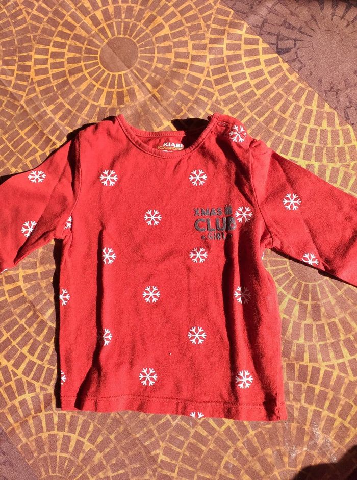 tee shirt fille 6 mois couleur rouge motif flocons de neige marque kiabi tres bon etat