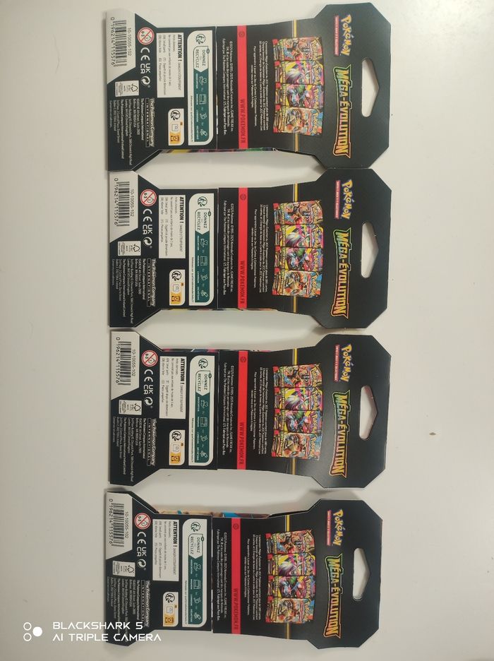 Je vends ce lot de 4 blisters de cartes Pokémon Méga Évolution de la marque Asmodée. - Type de produit : Jeu de cartes à collectionner - Marque : Asmodée - Gamme / Licence : Pokémon - Composition du lot : 4 blisters de cartes Pokémon Méga Évolution État neuf. Des heures de plaisir à collectionner et jouer avec ces cartes Pokémon ! N'hésitez pas à me contacter pour plus d'informations.