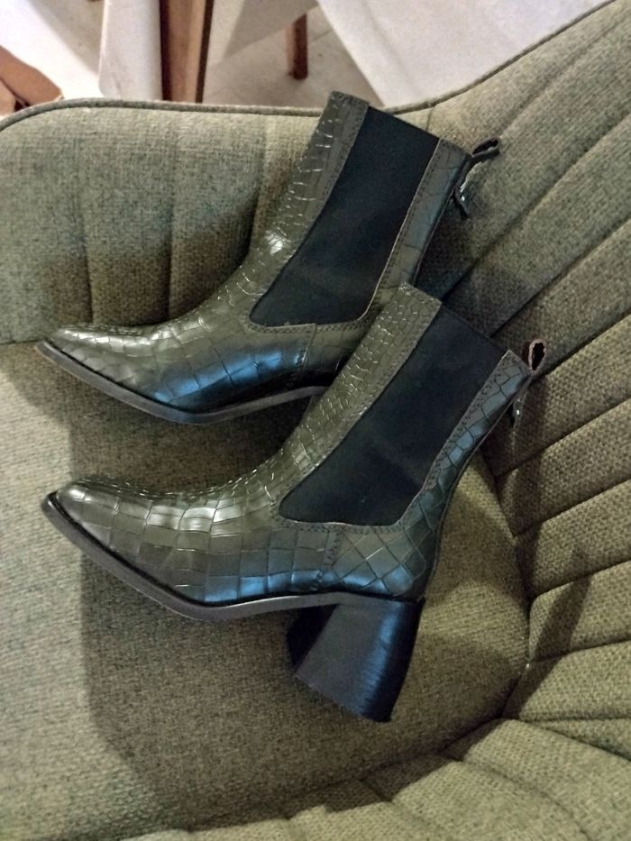 Jolies bottines kaki en très bon état. En taille 39 Hauteur de la tige de 20,5 cm Hauteur du talon de 8 cm Envoi rapide😊👍🏼