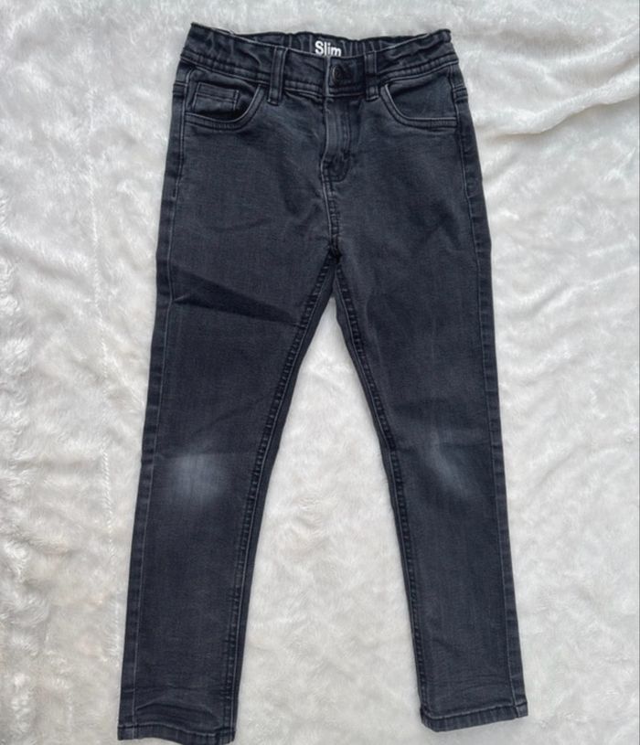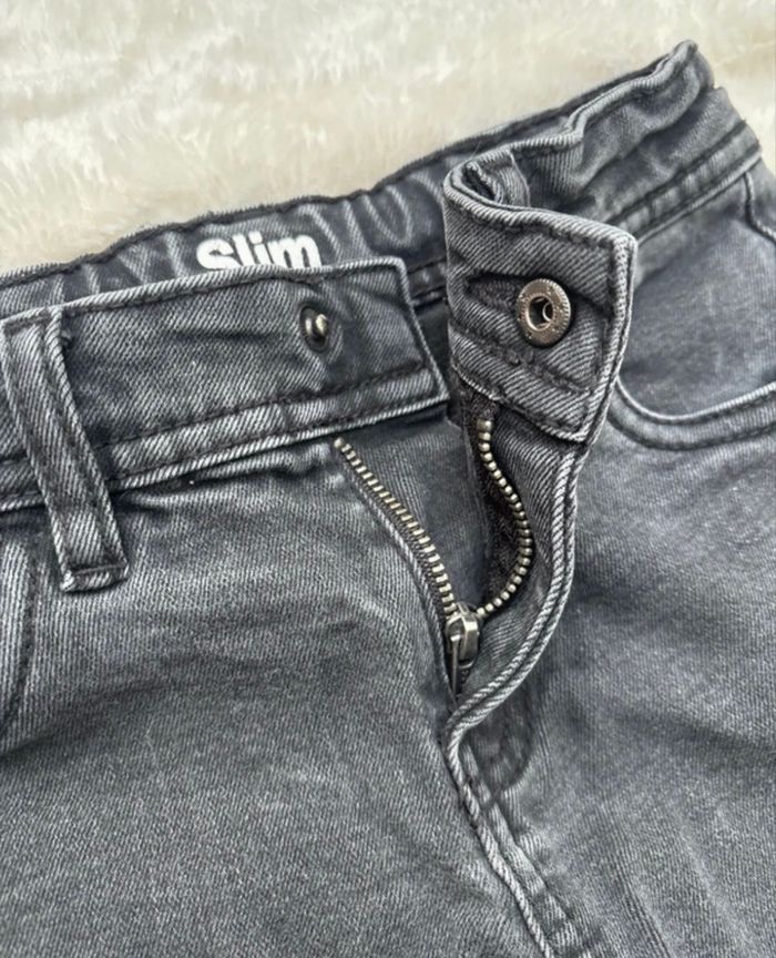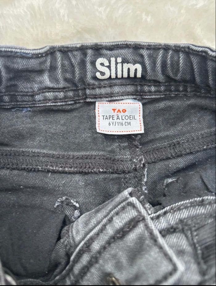 Jean slim TAO Couleur anthracite Taille 6 ans Très bon état général ( voir photos ) : Étiquette arrière légèrement décousu Délavage plus accentué genou droit