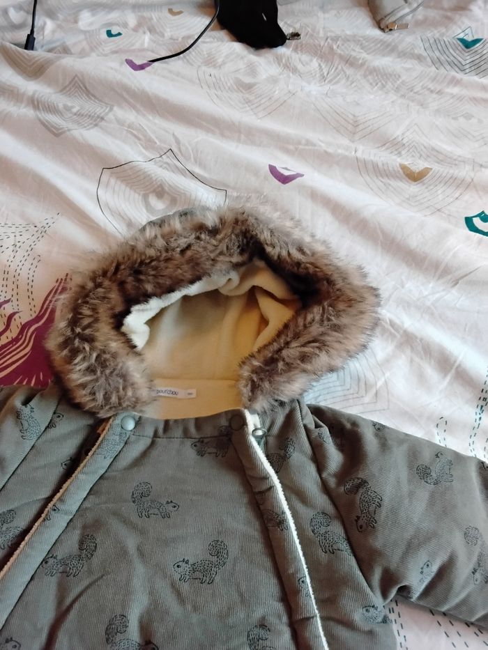 Combinaison pilote 9 mois motif écureuil, double fermeture éclair, capuche bordée de fausse fourrure, mains protégées par rabat