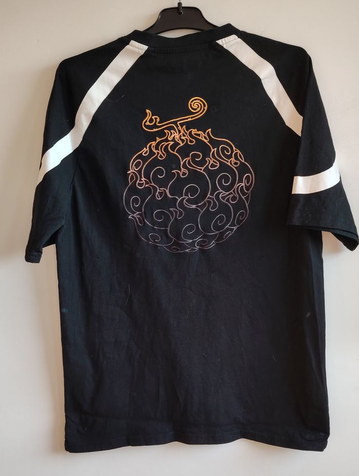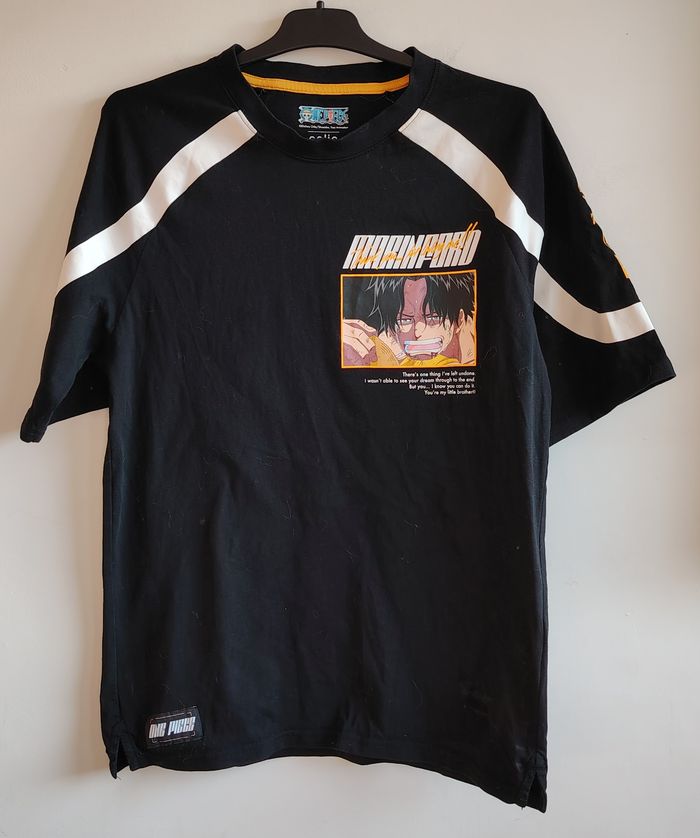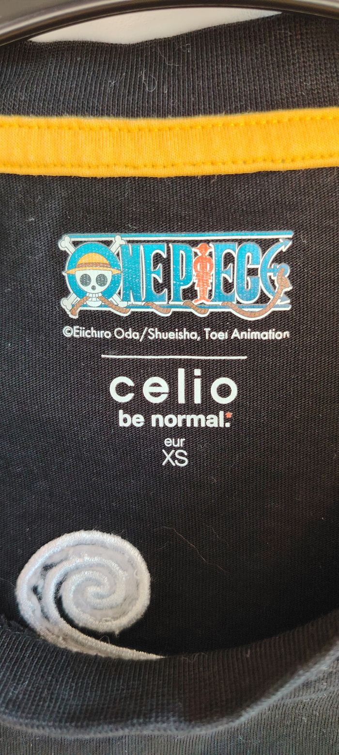 T-shirt One Piece x Celio noir, taille XS, avec design manga/anime 🔥🏴‍☠️ Modèle original avec imprimé sur le devant (personnage + texte) et grand motif au dos (fruit du démon) super stylé. Coupe confortable, manches courtes avec bandes blanches sur les épaules, col rond avec détail jaune à l’intérieur. Parfait pour les fans de One Piece, look streetwear, casual ou collection. ⚠️ Présence d’une petite trace/zone légèrement marquée en bas (visible sur photo).
