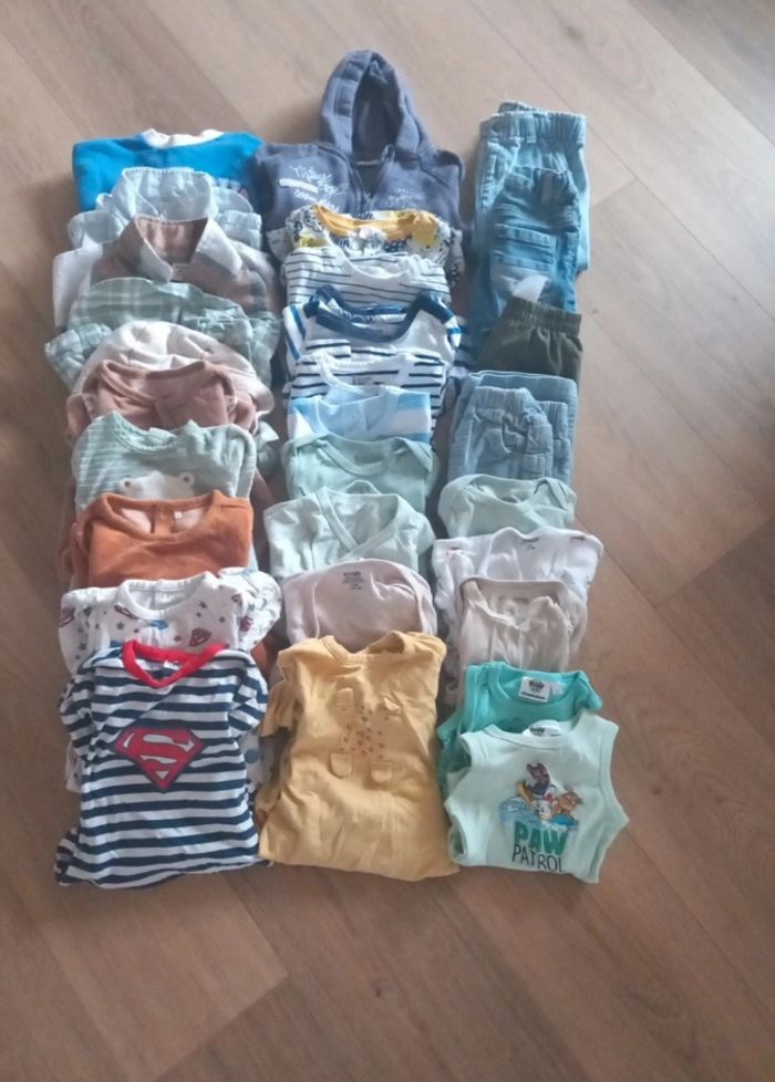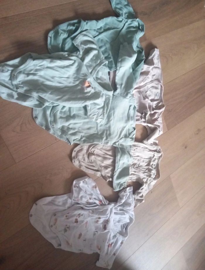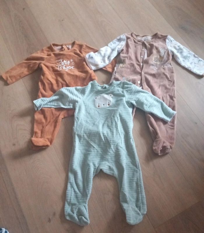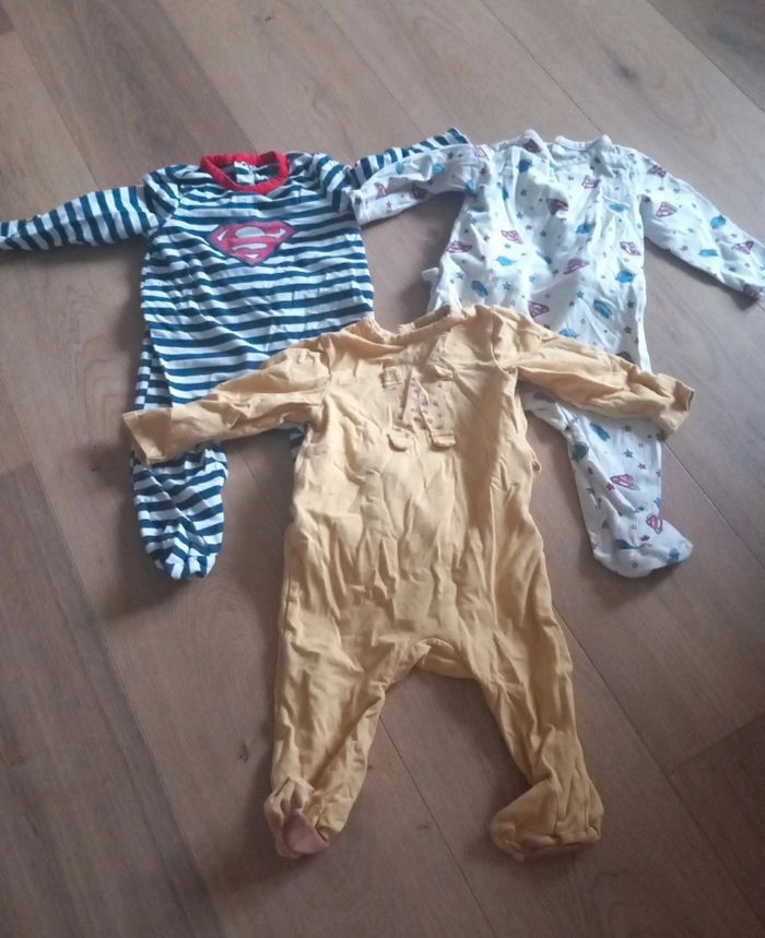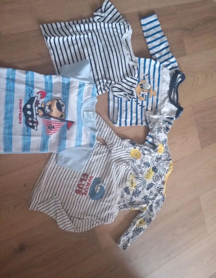 Comporte 1 pull 1 chemise 2 vestes 3 pyjamas chaud 3 pyjamas fins 8 bodies manches courtes et longues 4 pantalons 5 hauts 1 gilet chaud Certains vêtements très peu porté voir pas du tout.