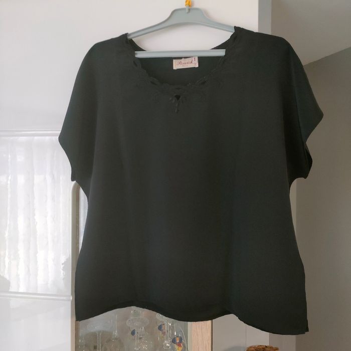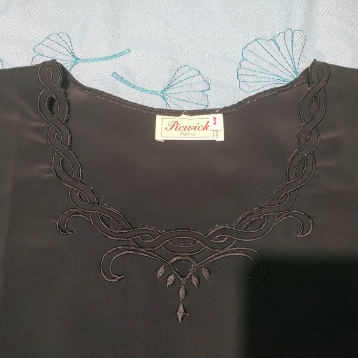 Bustier noir avec broderie au col. Très bon état. Made in France. Taille 3 (XXL). Dimensions épaule 44 cm et longueur 58 cm. Marque Picurick Paris.