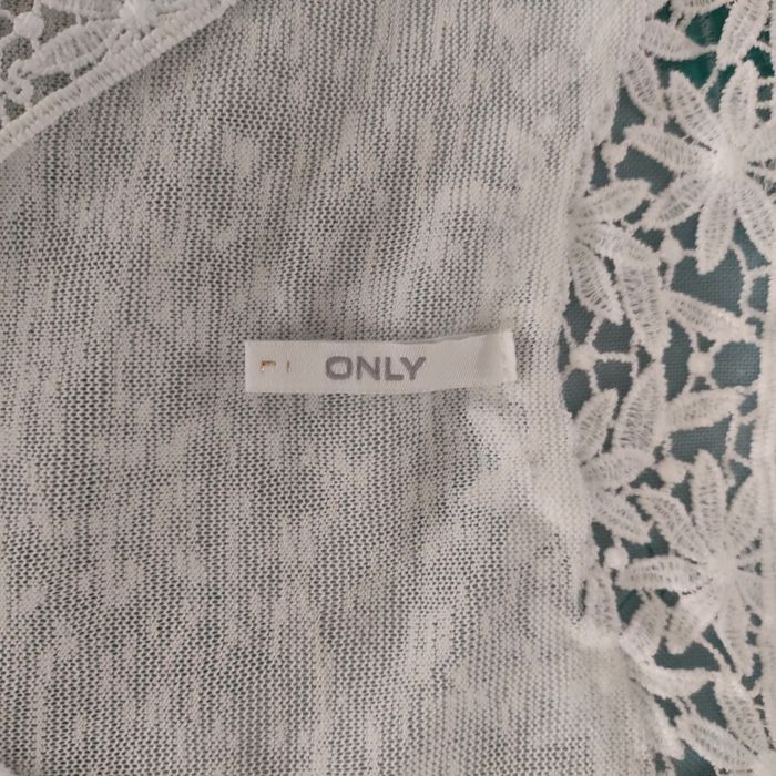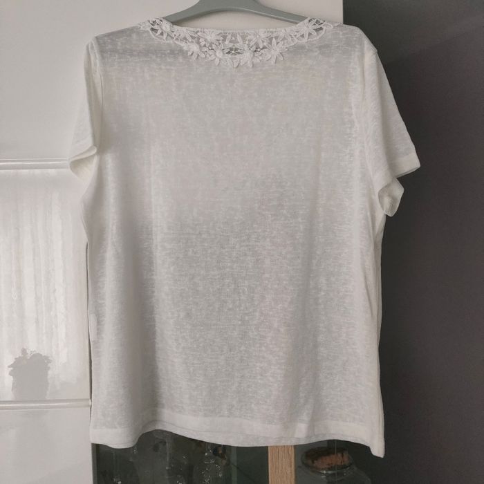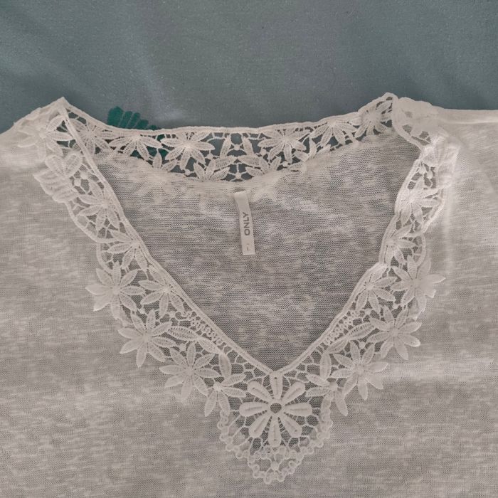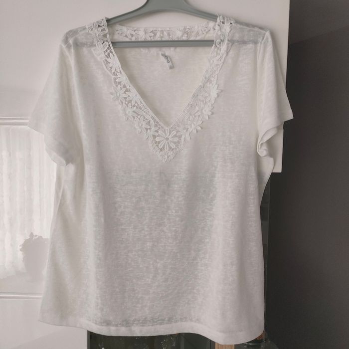 Tee-shirt blanc avec col fantaisie en V. Matière coton et acrylique. Taille 42, marque ONLY. Largeur épaule 42 cm et longueur 59 cm.