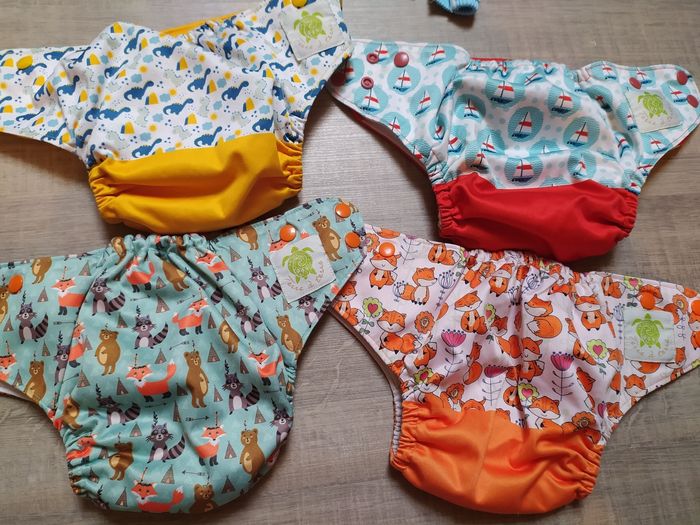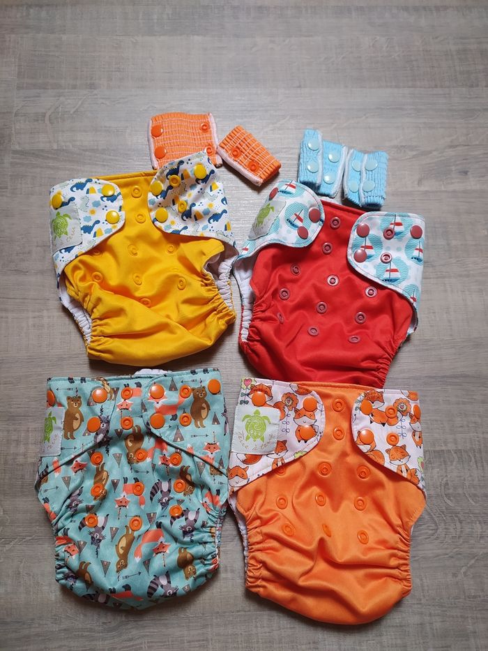 Lot de 4 couches lavables à poche pour ajouter un insert absorbant dedans. Effet petit popotin. Motifs bateaux, forêt, renard et dinosaures. 4 extension incluses pour augmenter le tour de taille. L'intérieur est un peu taché, voir photos.