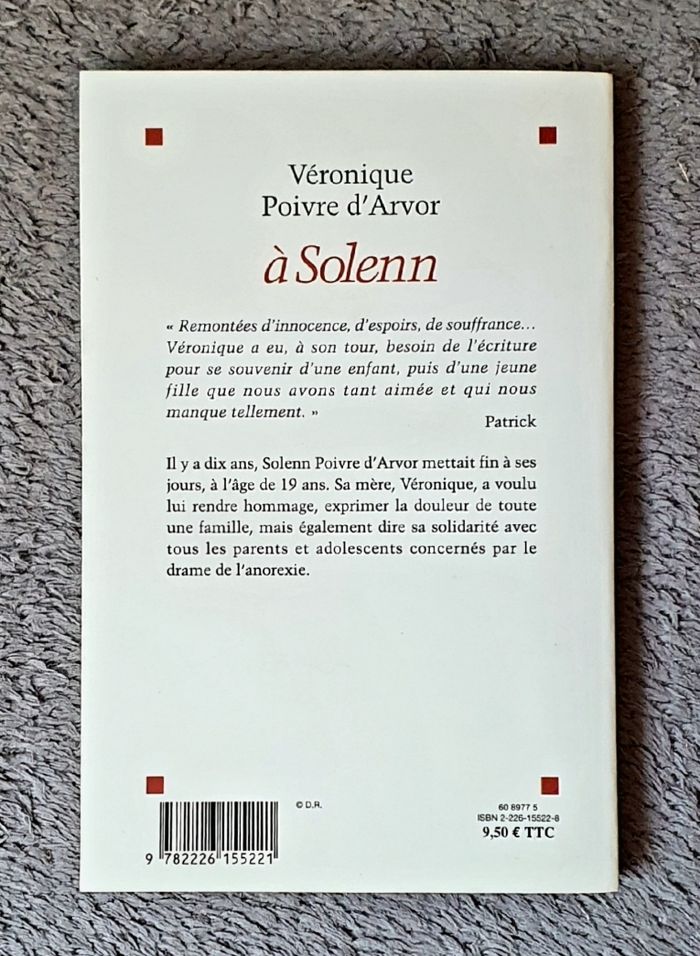 Résumé : «Remontées d'innocence, d'espoirs, de souffrance... Véronique, tu as eu, à son tour, besoin de l'écriture pour te souvenir d'une enfant puis d'une jeune fille que nous avons tant aimée et qui nous manque tellement». Patrick. Il y a dix ans, Solenn Poivre d'Arvor mettait fin à ses jours, à l'âge de 19 ans. Sa mère, Véronique, a voulu rendre hommage à sa fille, exprimer la douleur de toute une famille mais également dire sa solidarité avec tous les parents et adolescents concernés par le drame de l'anorexie.. Date de parution : 05/01/2005. Auteur : Véronique Poivre-d'Arvor. Éditions : Albin Michel. Dimensions du livre : 20x13Cm. =) 144 pages. Montant d'achat magasin : 9.50E. État comme neuf.