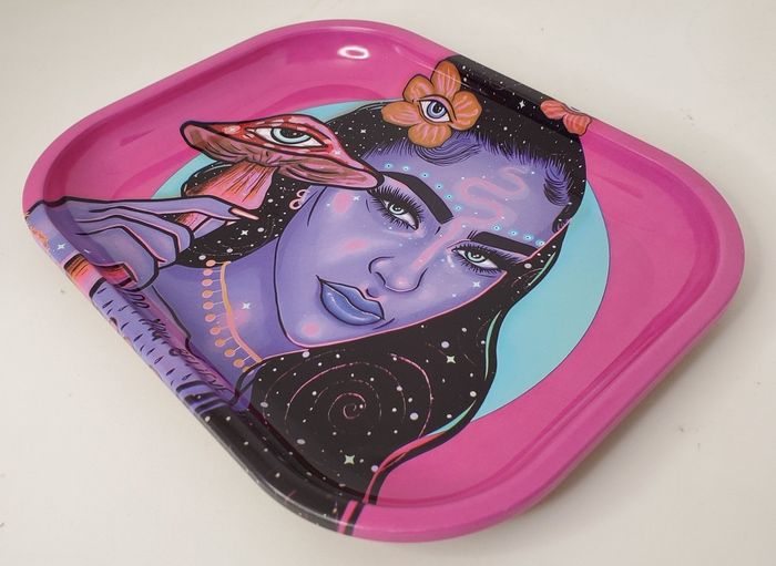 Plateau de roulage en métal neuf. Modèle Femme champignon. Taille 18×14 cm.