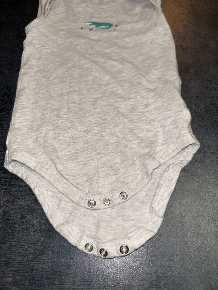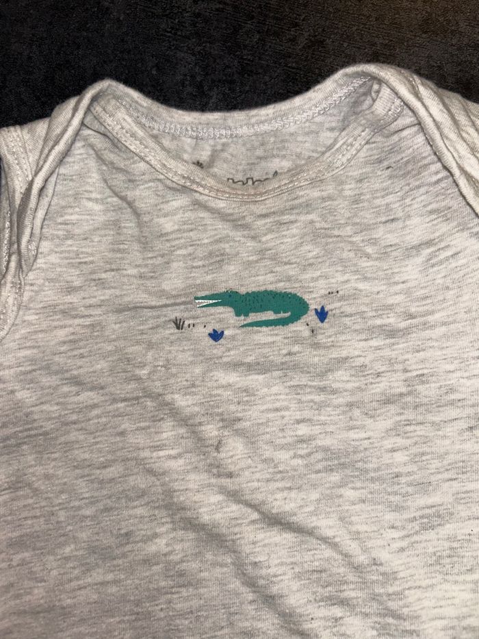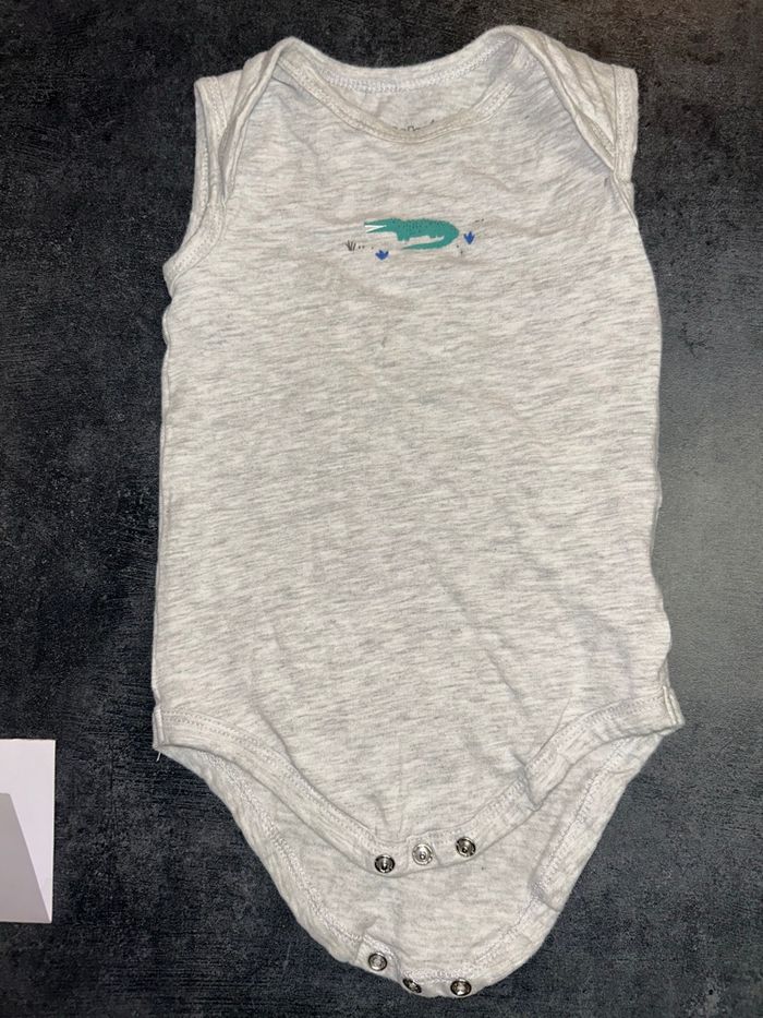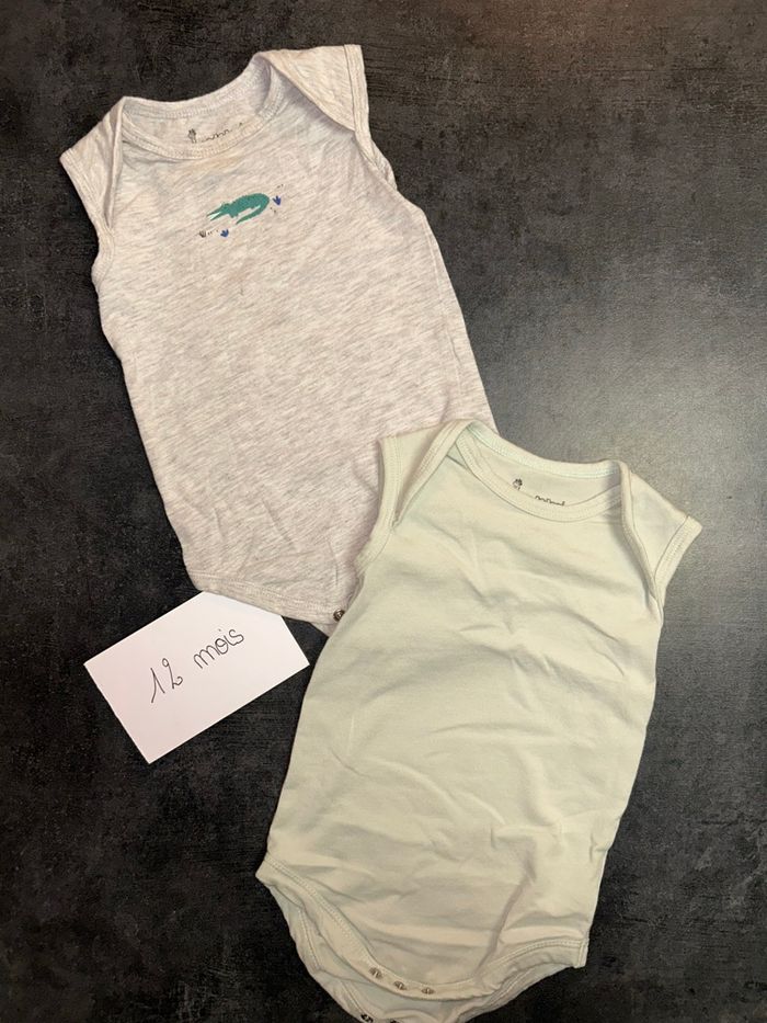 Lot de 2 bodies bébé sans manches avec attache par pressions à la couche N°1 : couleur gris avec motif crocodile N°2 : vert très clair uni Taille : 12-18 mois / 74-80 cm
