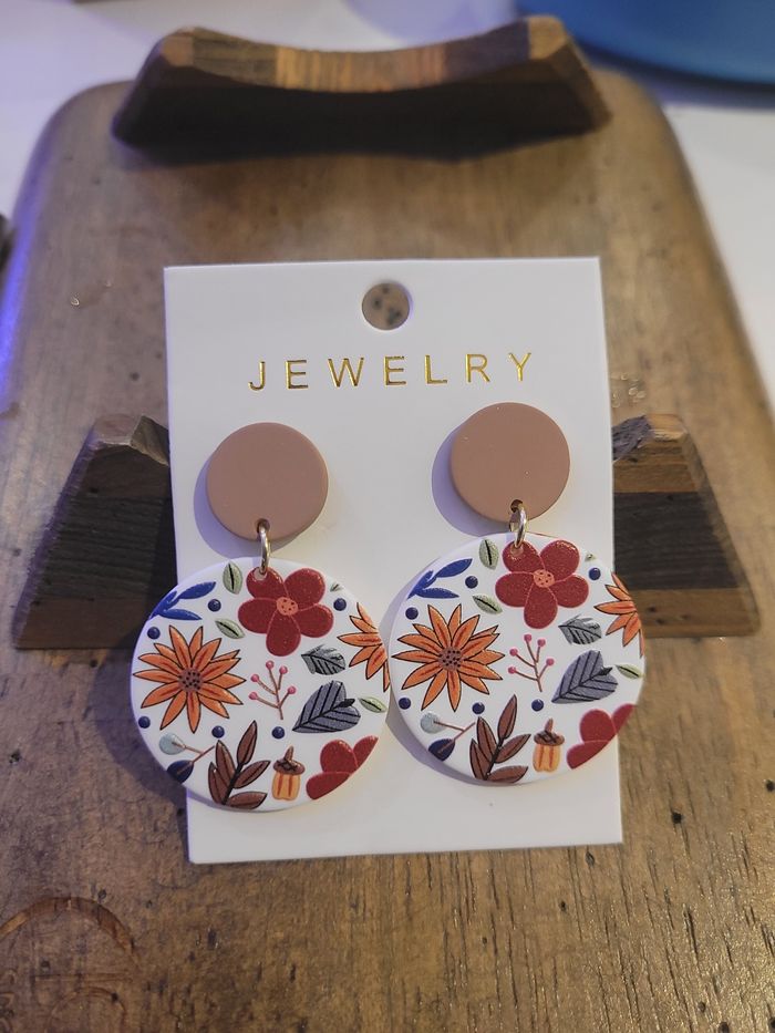 Jolies boucles d’oreilles neuves, jamais portées. Motif floral aux couleurs chaudes (terracotta, orange, rouge), très tendance et faciles à assortir. Légères et agréables à porter, parfaites pour le quotidien ou pour offrir. ✔️ État : neuf ✔️ Style : bohème ✔️ Fermeture : clous