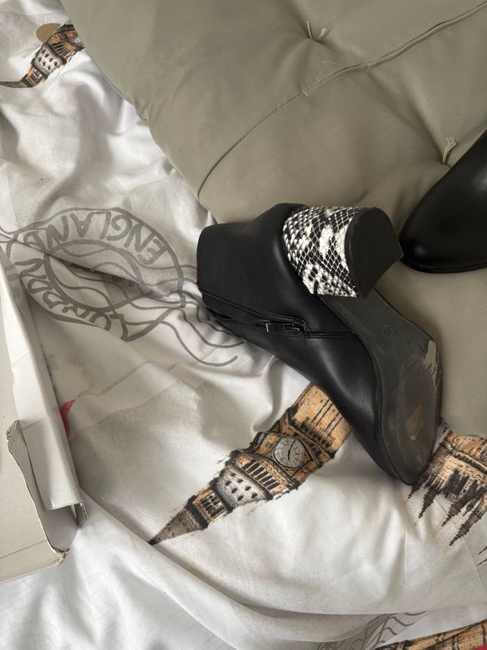 Bottines noires avec talons blancs et noirs neufs jamais portées Pointure 39 Très originales ces bottines sauront accompagner toutes vos tenues de par sa couleur noire qui amène la sobriété mais aussi beaucoup d'originalité avec ce talon blanc et noir Pointure 39 Pour un look sobre et original Je recommande vivement Prix : 7,50 e