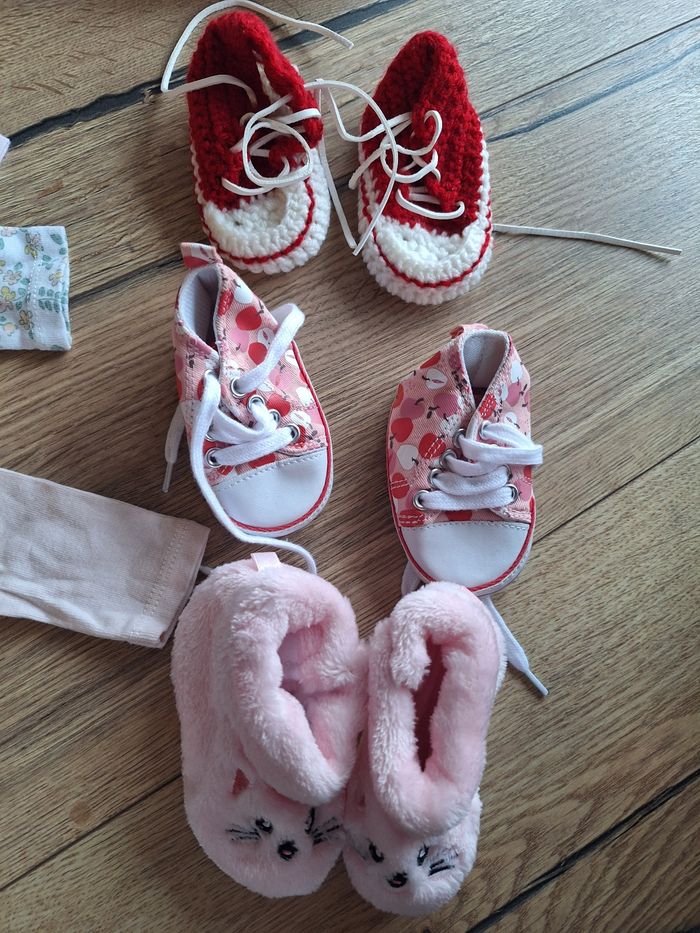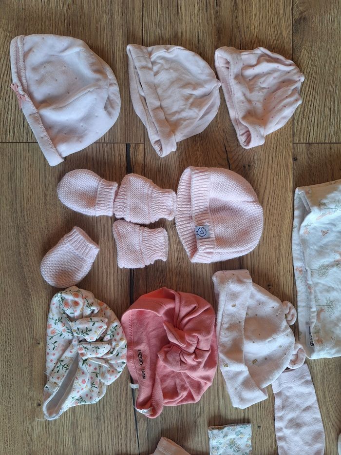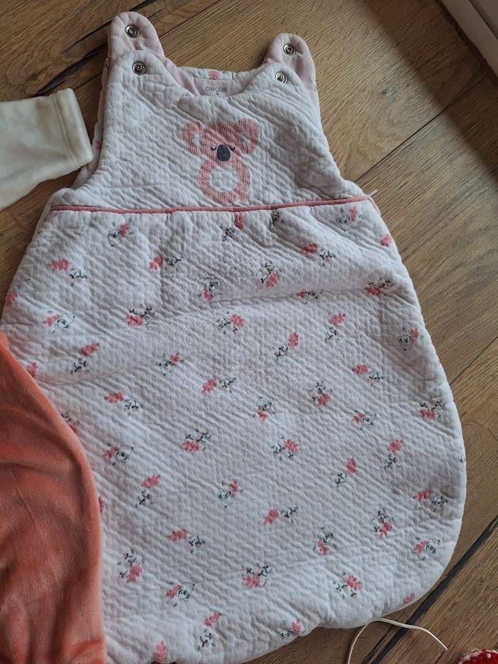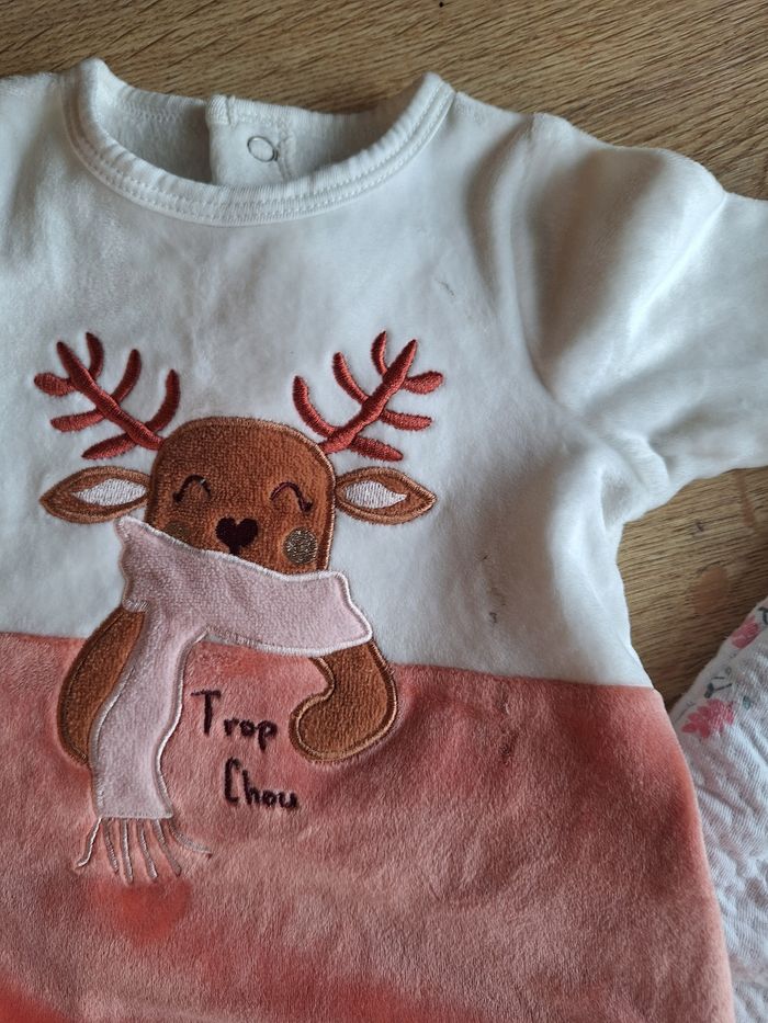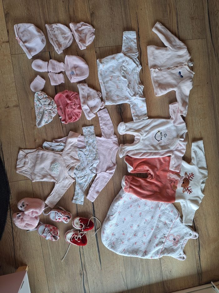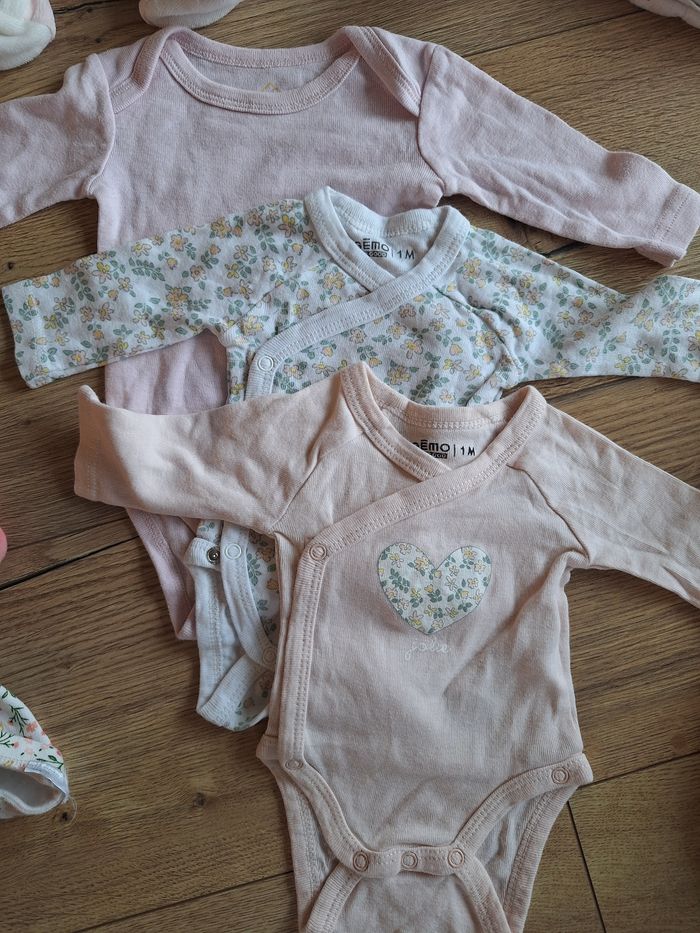 Ce compose de : 3 bodies 1 mois gemo et tex 1 gilet orchestra 1 mois 1 sweat gemo 1 mois 1 pyjama neuf 1 mois gemo mais trace d'autocollant dessus 1 pyjama smiley baby prema 45cm 2 paires de gants 3 paires de chaussures 7 bonnets 0/1moisa 1 gigoteuse obaibi 0/3 mois attention légère trace suite a lavage sur le pourtour