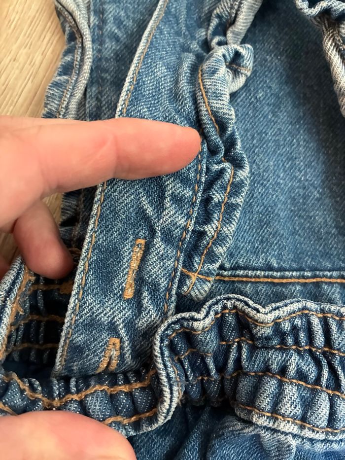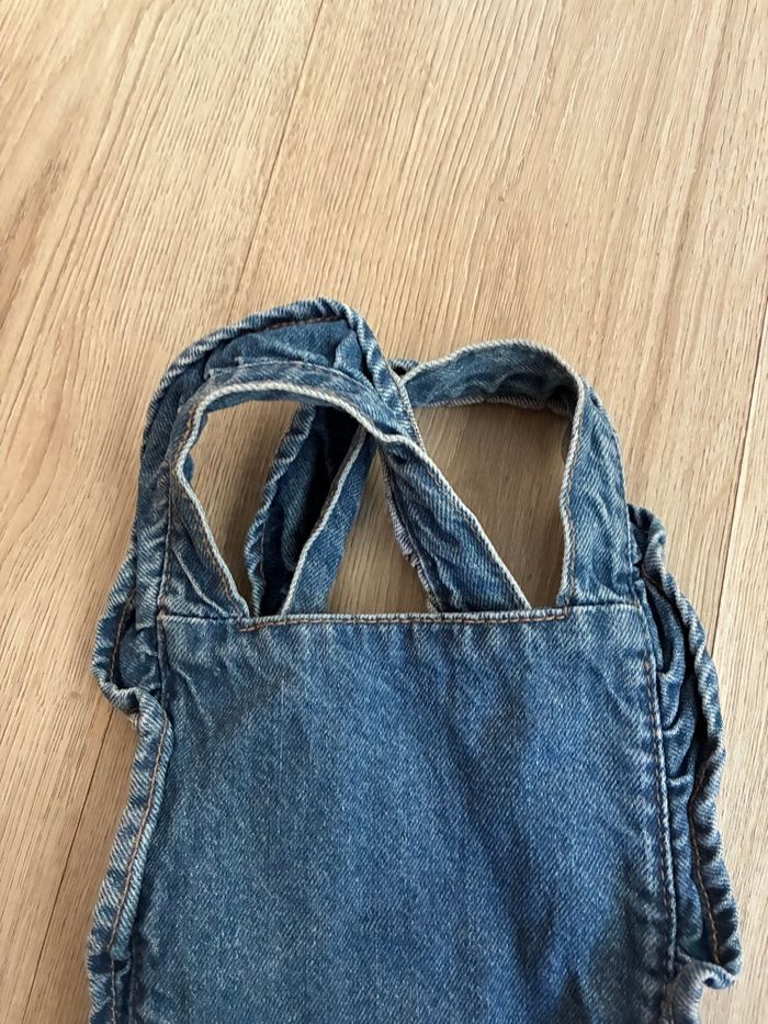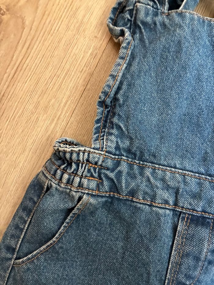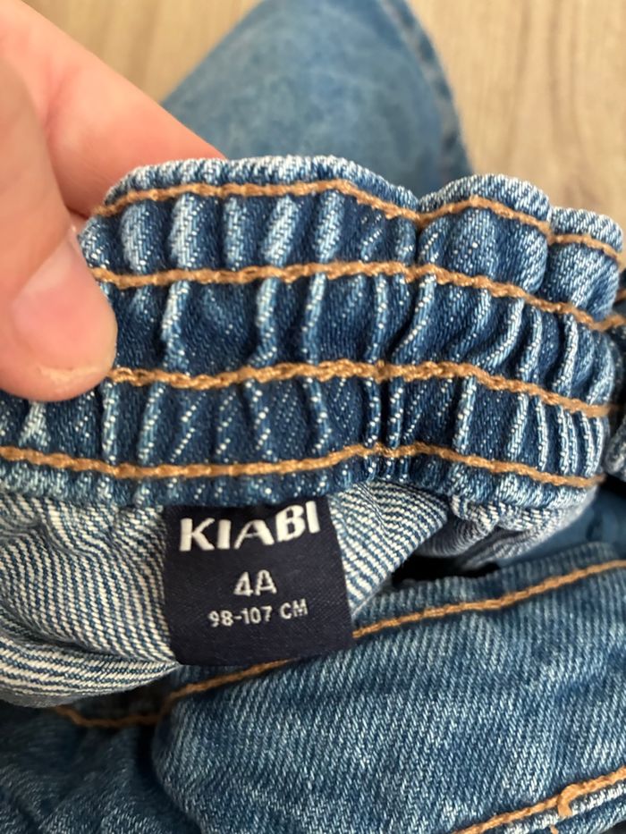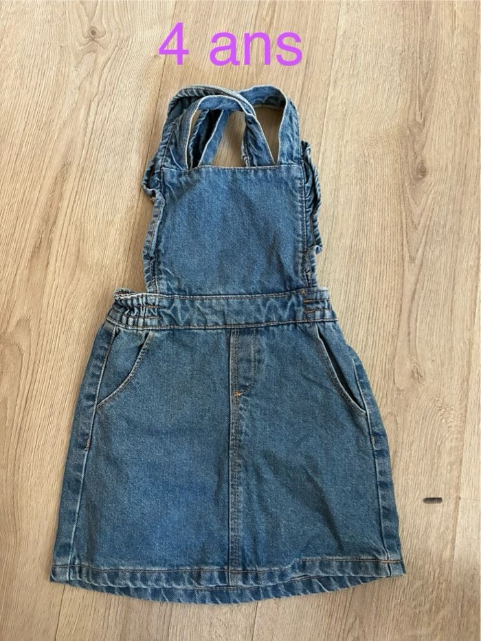 Robe en jean à bretelles. Taille élastique. Possibilité d’ajuster la hauteur des bretelles grâce à 2 boutons. Taille : 4 ans, 98-107 cm. Marque : Kiabi