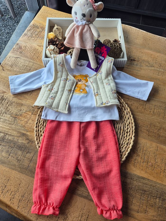 🧸 Ensemble Bébé Fille Pantalon, Tee-shirt et Gilet 3 pieces 📏 12 mois 💠 100% Coton 🌀 Fabrication Française 🏷 Etat Neuf, sous Blister 🚚 Envoi Rapide et Soigné