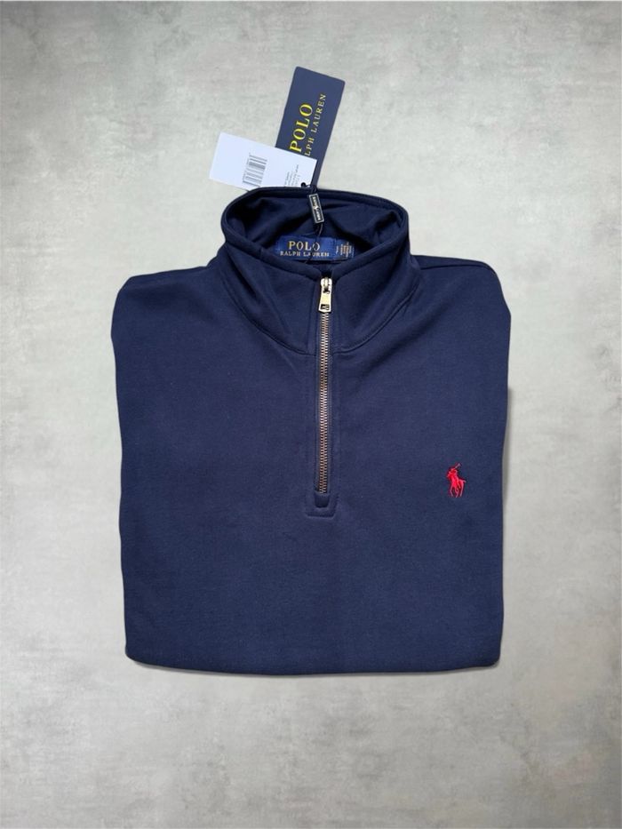 Pull half-zip Ralph Lauren bleu – Logo rouge – Taille S