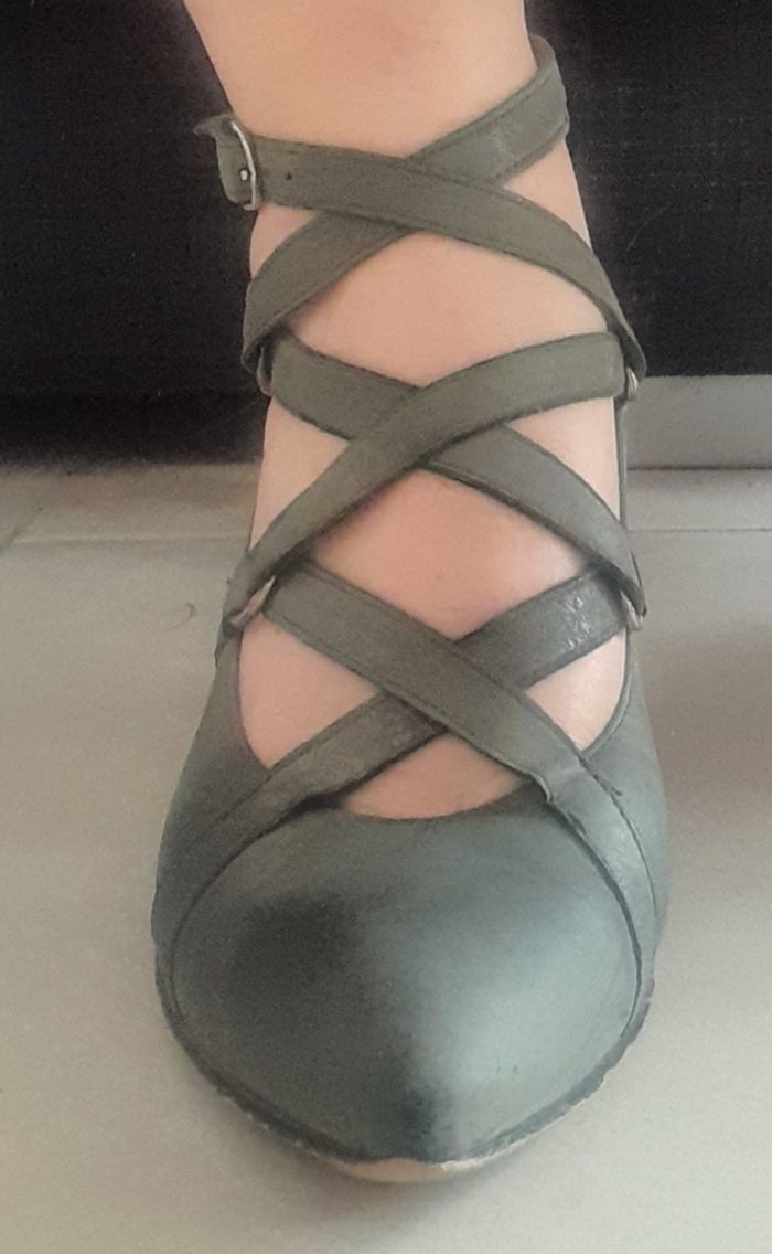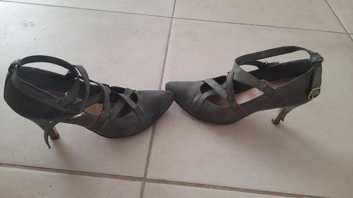 Chaussures à talons hauts Hauteur des talons 8 cm Pointure 37 Lanières entrelacées. Fermeture par boucle Couleur kaki Photos des différences traces d'usure.