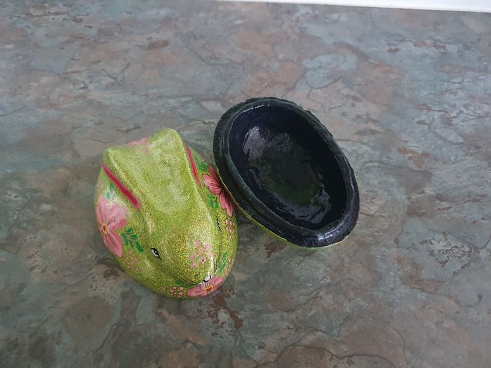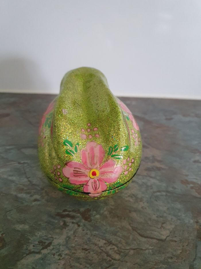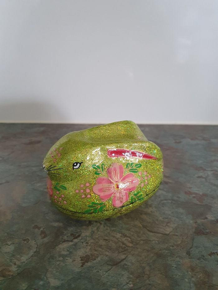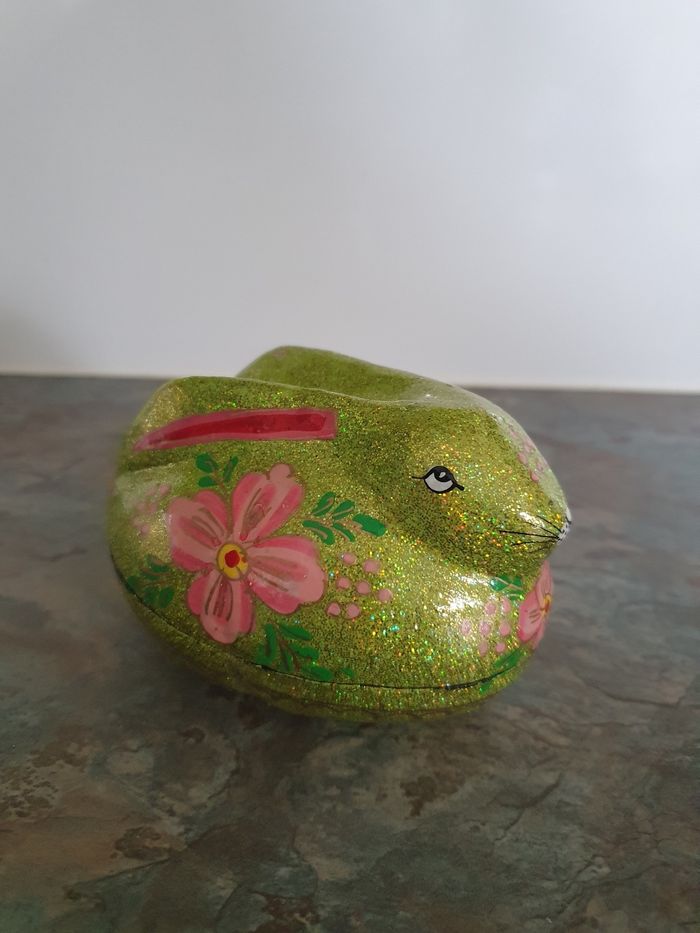 A vendre boite en forme de lapins, qui s'ouvre pour y mettre des chocolats, des petits trésors, de l'argent... coloris vert pailletté. En très bon état ! N'hésitez pas à jeter un coup d'œil sur mon dressing. Une réduction dès 2 articles achetés !