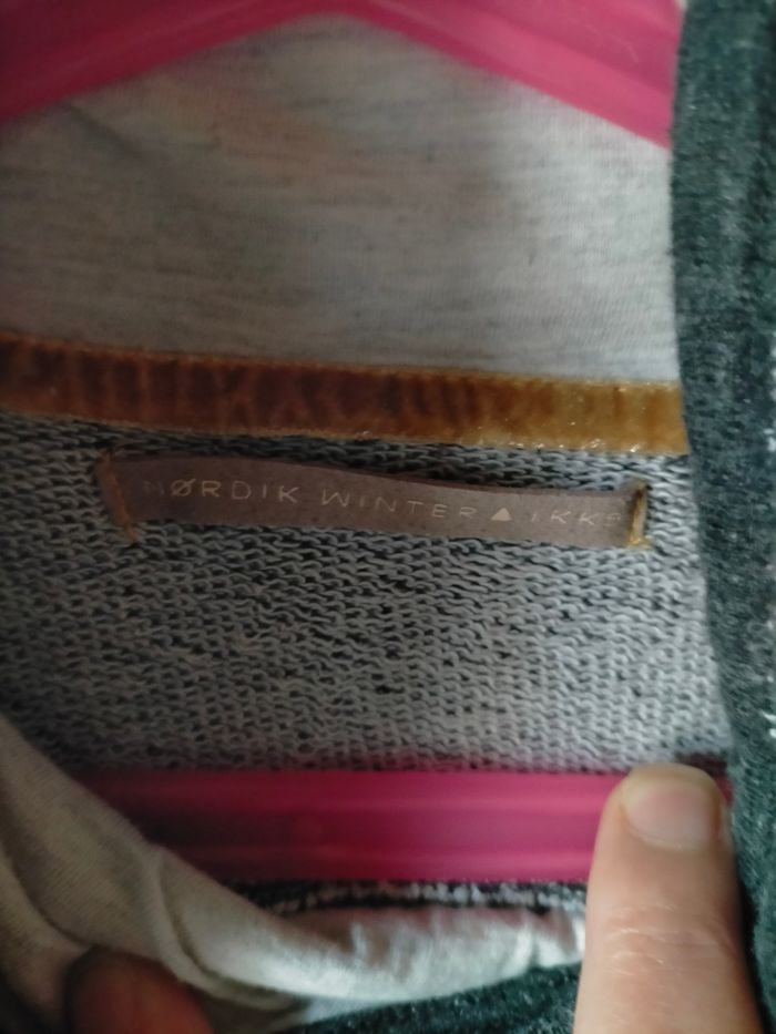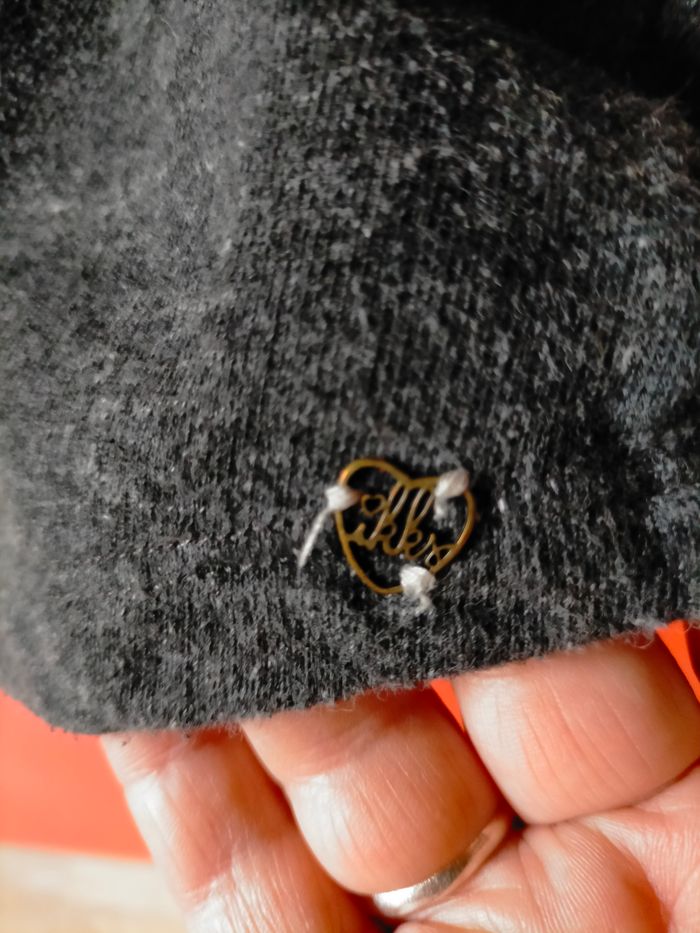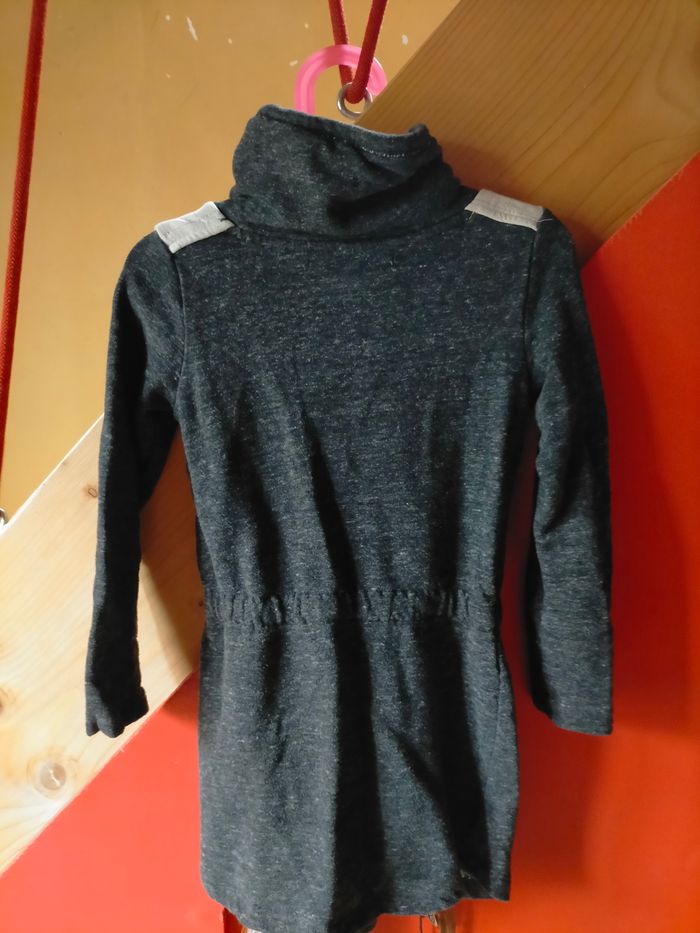 TBE Très jolie robe à manches longues en molleton anthracite chiné. Grand col doublé, taille élastique avec nœud et motif Love brillant devant