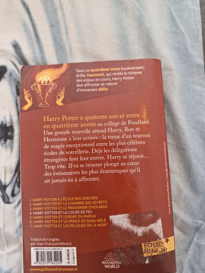 Vends le livre Harry Potter et la Coupe de Feu de J.K. Rowling (tome 4). Édition Folio Junior – Gallimard Jeunesse, en français. 📌 État : correct Couverture avec traces d’usure visibles Dos légèrement marqué Pages intérieures propres, complètes et bien lisibles Idéal pour la lecture ou compléter une collection à petit prix.