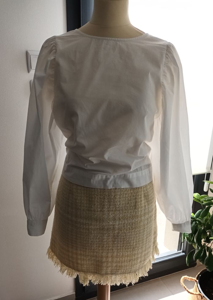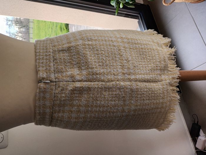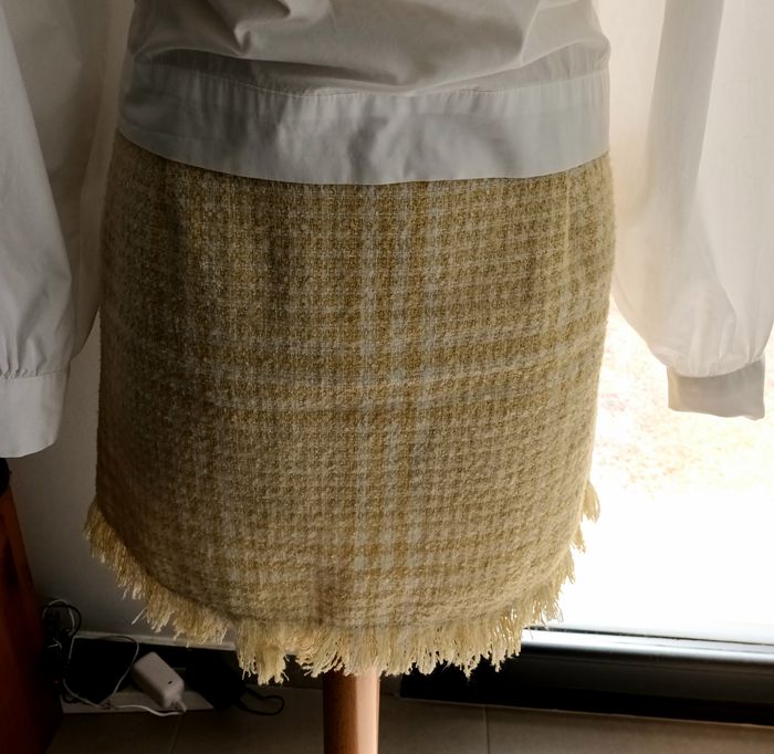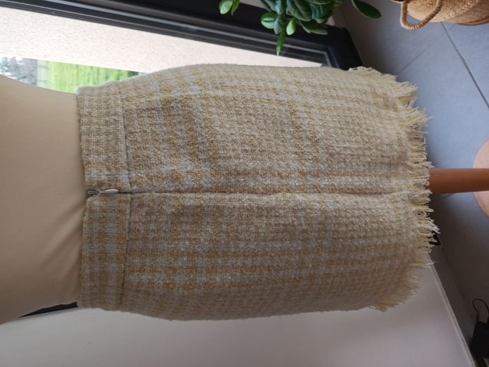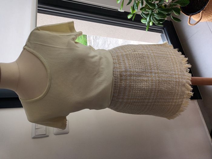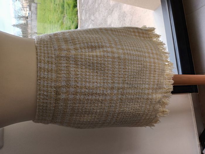 Jupe courte de marque Vila avec franche sur le bas, maille bouclette, motif carreaux jaune et blanc, la vrai couleur correspond à la première photo, tissu chaud et épais, 77% polyester, 16% coton et 7% viscose, zip invisible à l'arrière. Notée taille 40 mais taille petite correspond davantage à un 40, voici les dimensions : Largeur taille 40 cm env, Longueur 46 cm env. #jupemaillebouclettefemme40 #jupecourteerchaudefemme40 #jupejauneetblanchefemme40 #jupeacarreauxfemme40