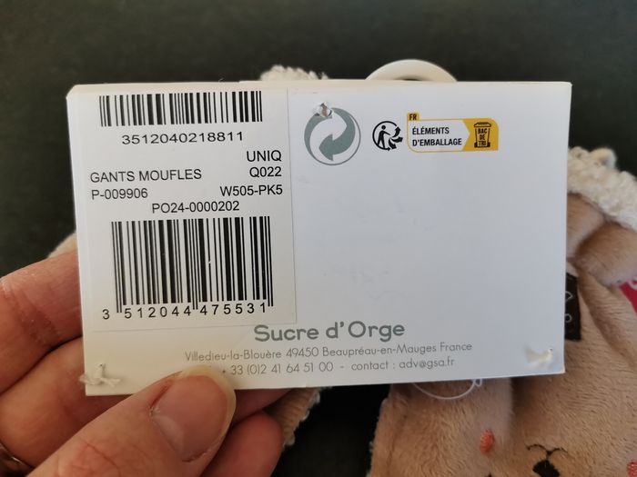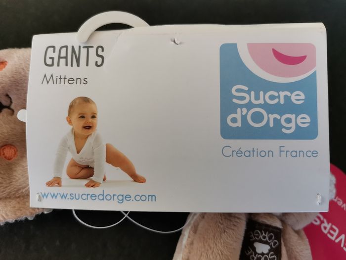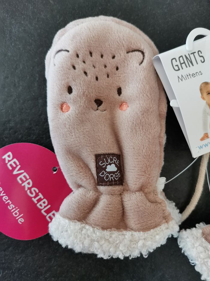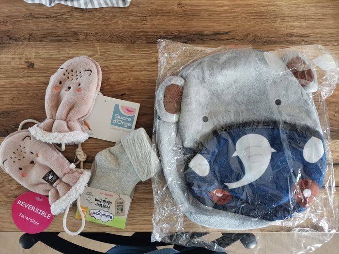 Lot comprenant : - 1 paire de gants réversibles Sucre d'Orge - 1 paire de chaussettes naissance Babydream - 1 sac à dos