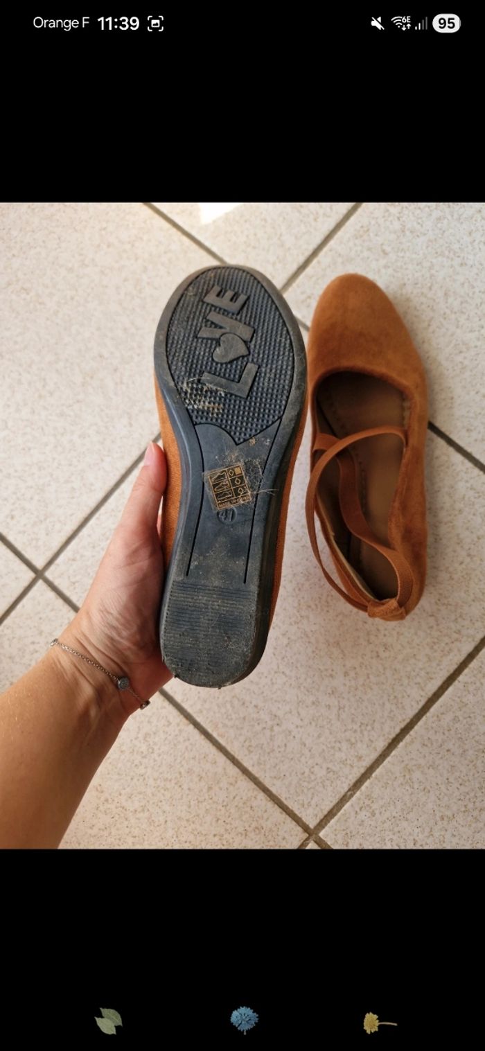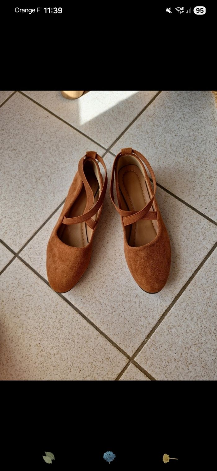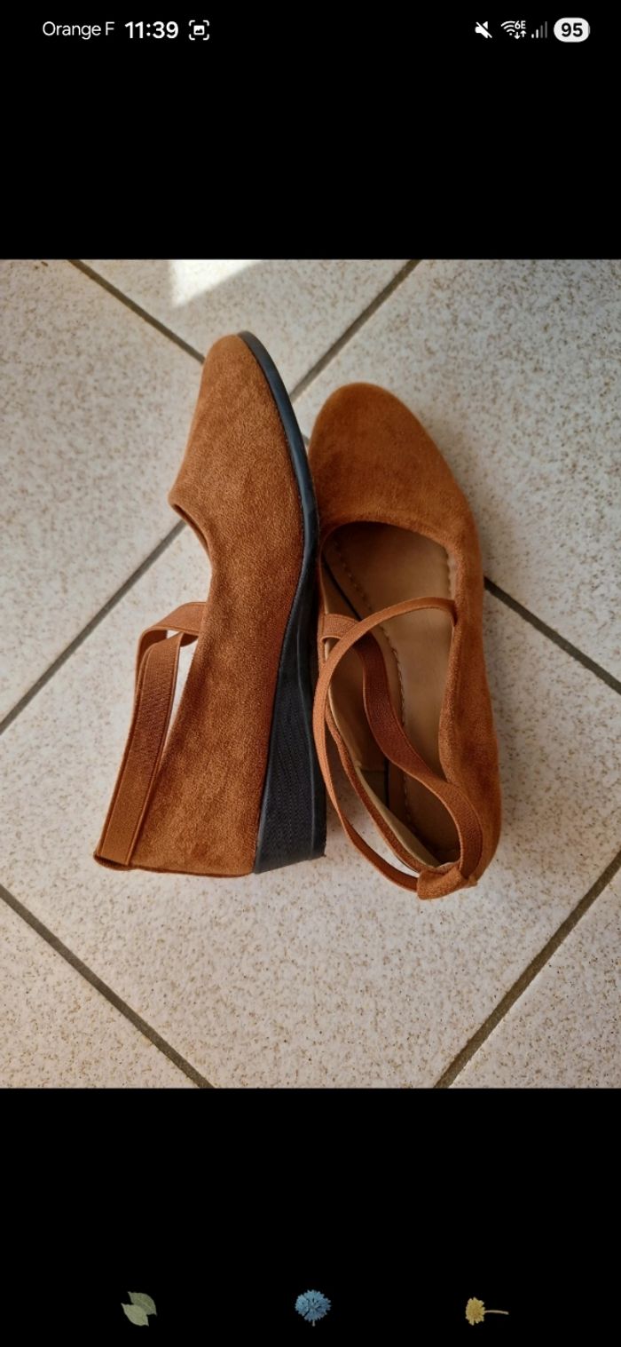 Ballerine sans marque maron , taille 41 mais taille petit, plutôt du 39/40. Porté 2/3 fois. Talon compenser de 3,5cm.