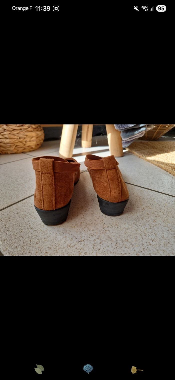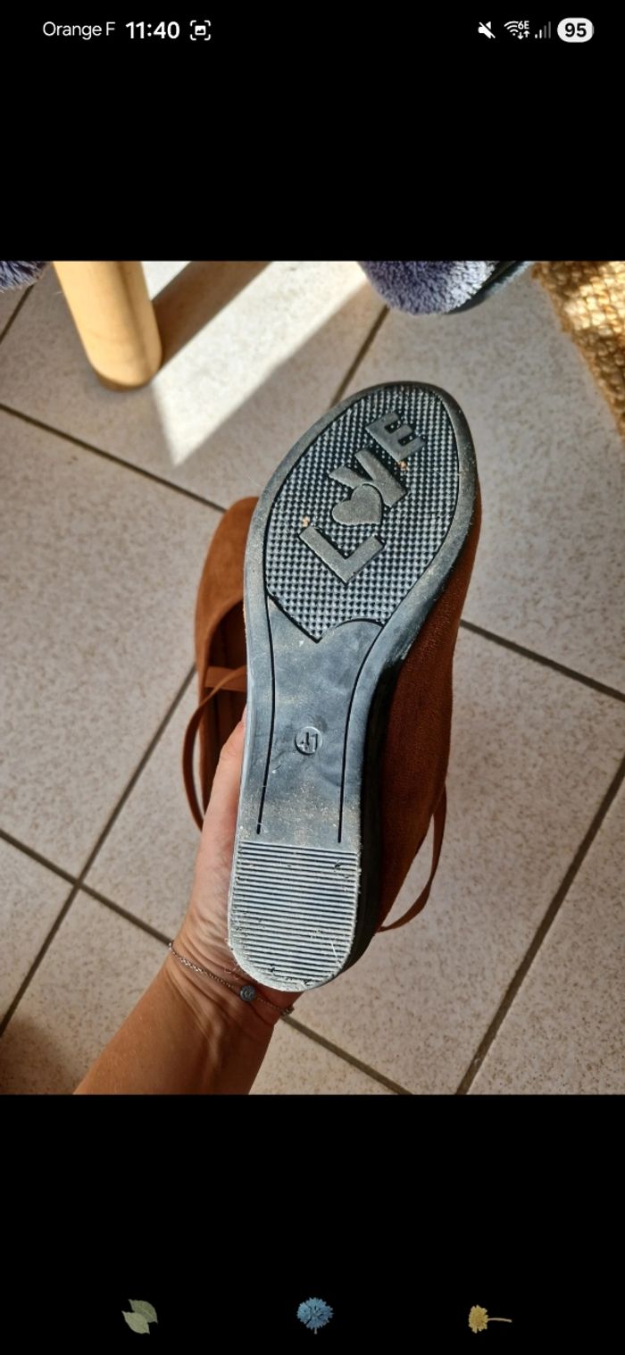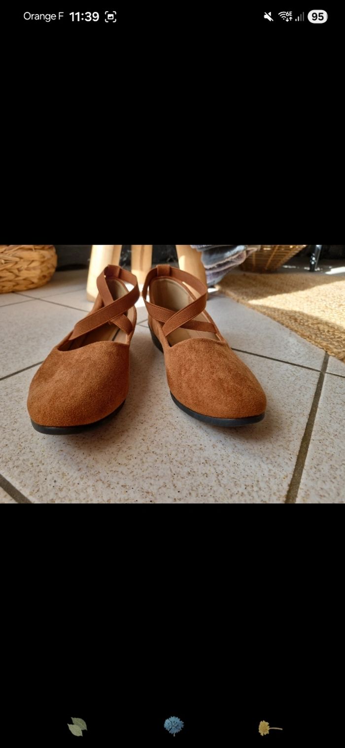 Ballerine sans marque maron , taille 41 mais taille petit, plutôt du 39/40. Porté 2/3 fois. Talon compenser de 3,5cm.