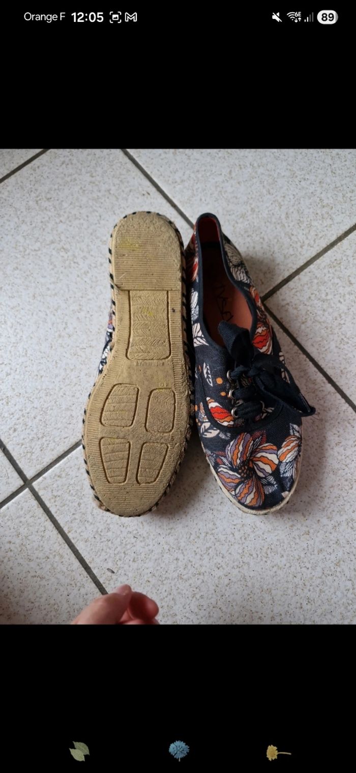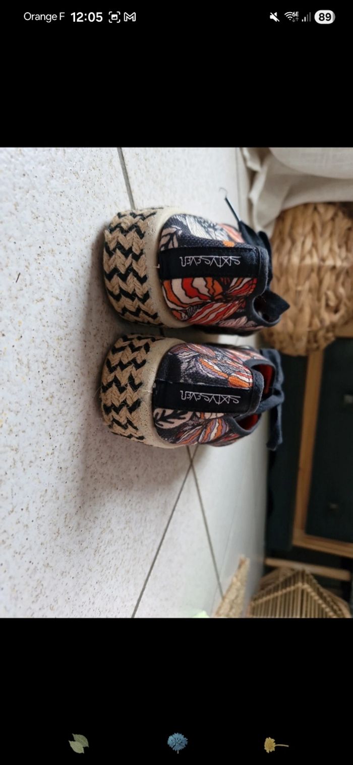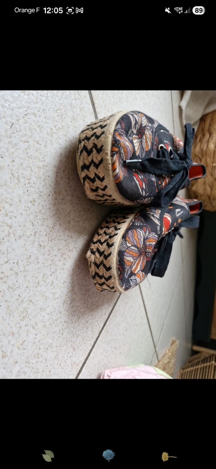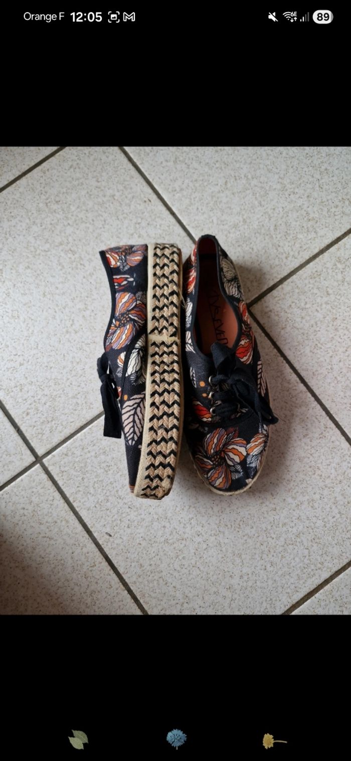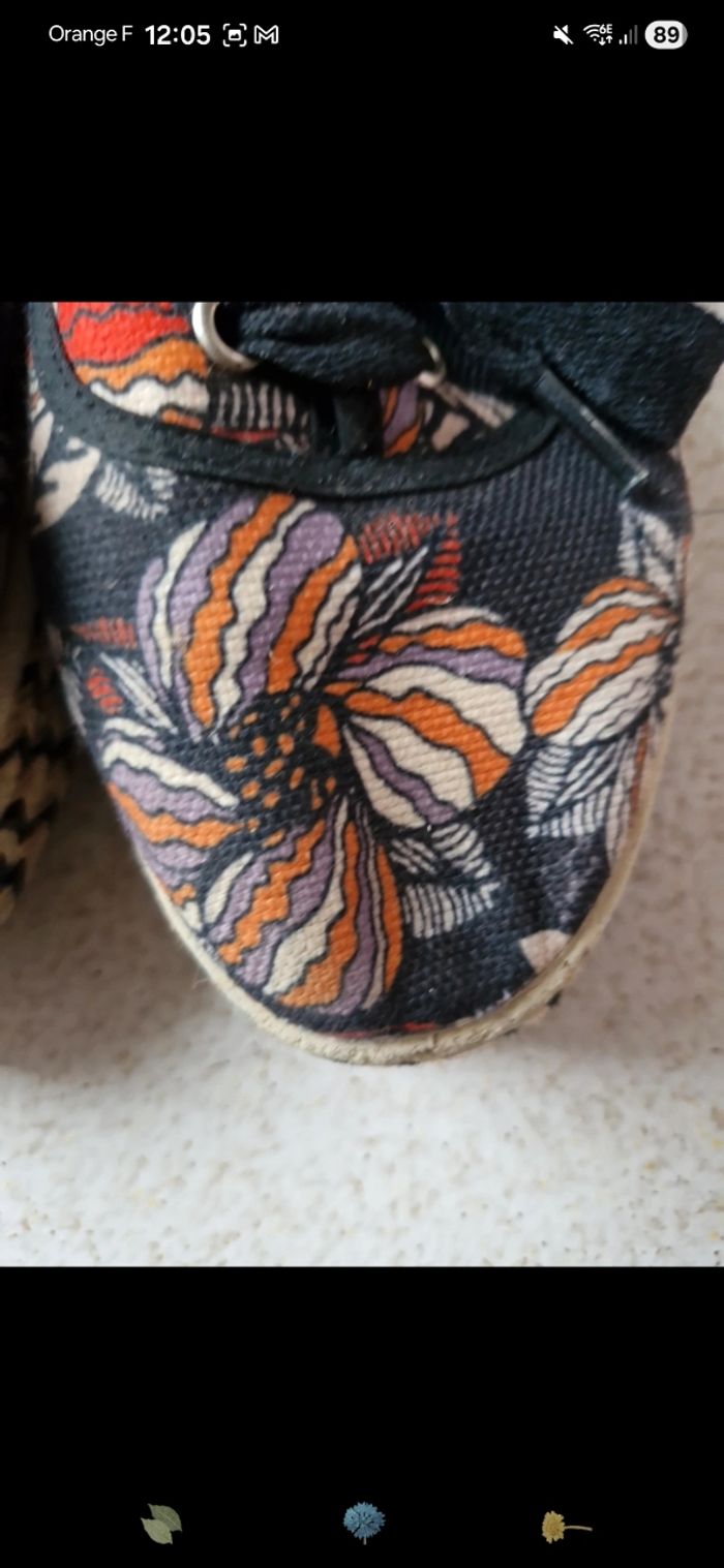 Chaussure plateforme genre espadrilles SixtySeven, noir orange à fleur. Taille 40.