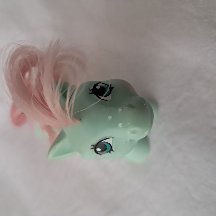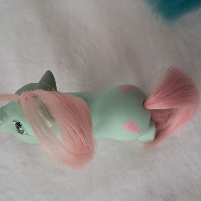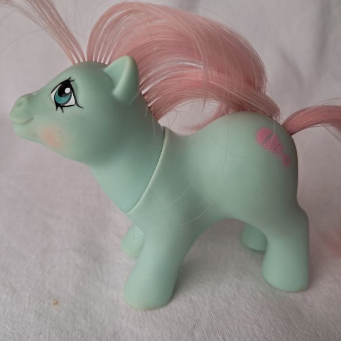 My little pony G1 Baby Cuddles Hasbro 1985 Made in Hong Kong Pat pend Hauteur : 7 cm Poids : 30 grammes Très bon état, juste le dessous des pattes légèrement jaune voir les photos.