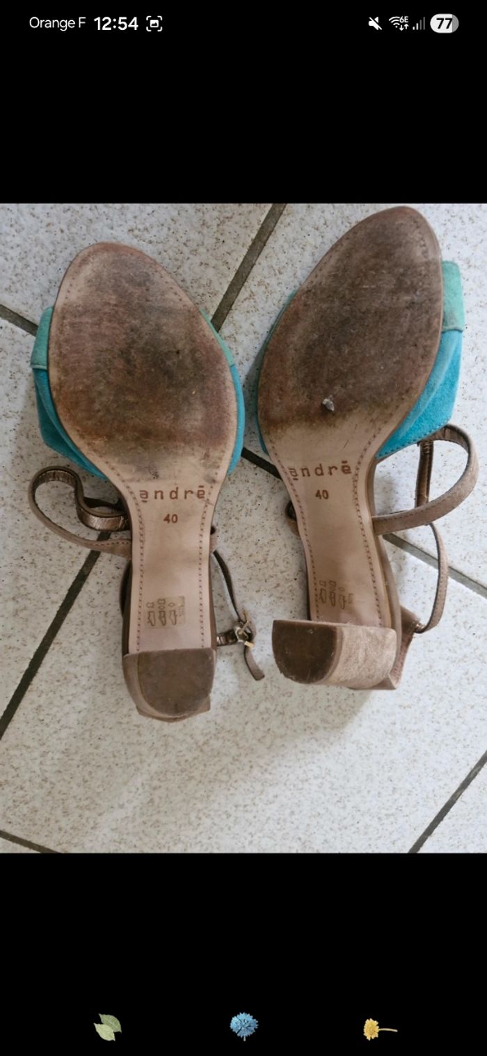 Chaussure à talon André, usure sur le dessous de la semelle, dessus en cuir. Talon 8cm, taille 40.