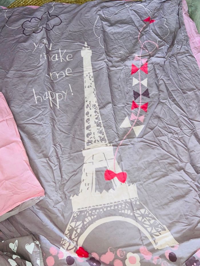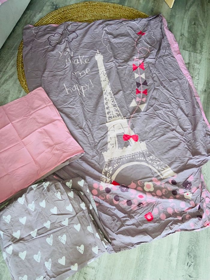 Parure lit 1 place 80x120 cm Avec coussin en cadeau offert !!! Drap housse offert avec des cœurs Tour effeil Paris En coton magnifique et incroyable Payée très chère Réversible
