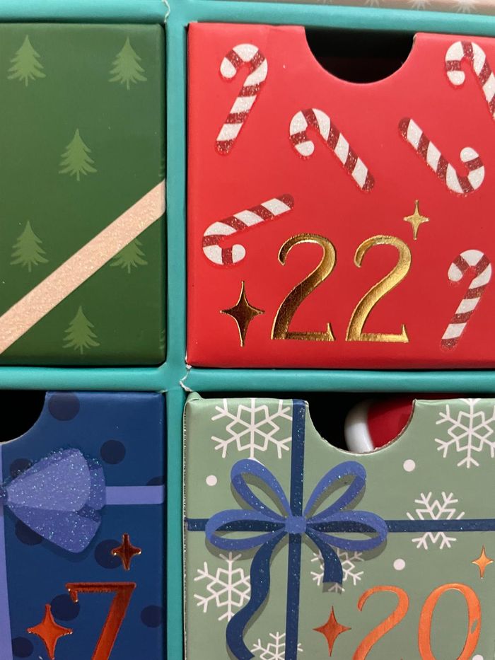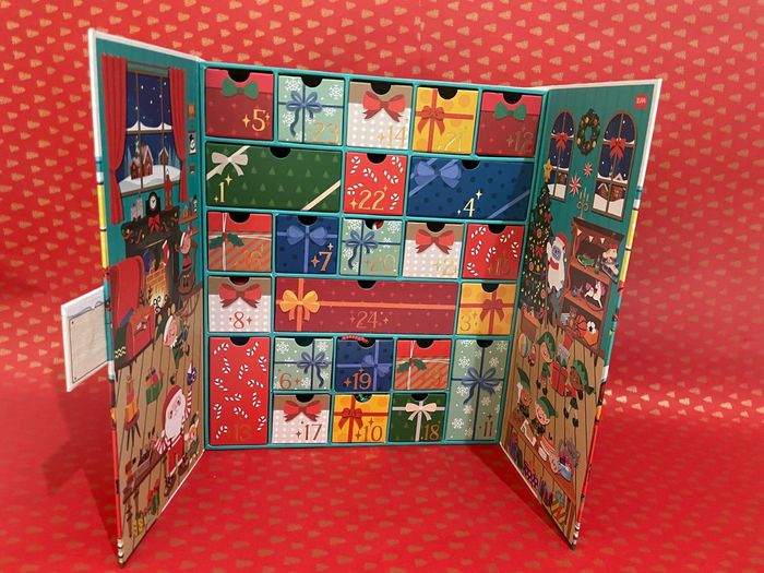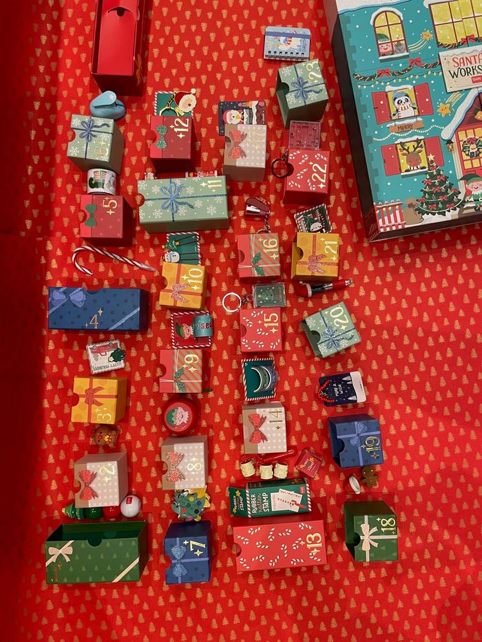 Calendrier de l’avent 2024 Legami vendu avec les 23 accessoires des cases 1 à 23, mais sans le stylo Yeti de la case 24. Le calendrier est neuf au sens où il a été manipulé seulement pour les photos. Il possède quelques défauts de fabrication qui sont visibles sur les 2 dernières photos: un tâche d’impression et une trace de colle au dos, le décor bleu présente des traces blanches aux croisillons de certaines cases. Prix négociable