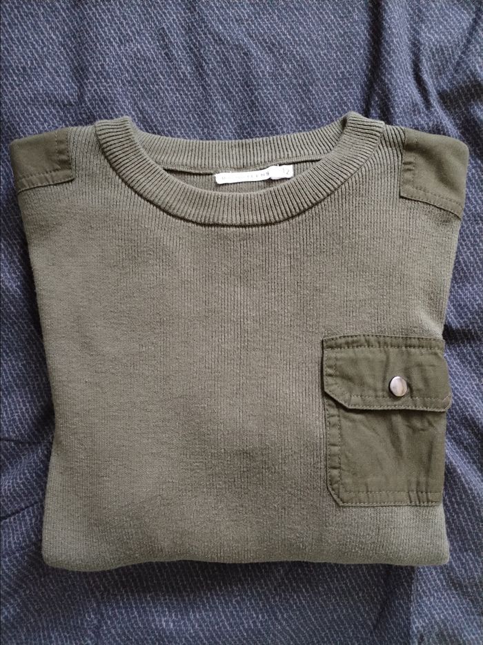 A vendre pull army avec poche pression sur le torse et pièces au niveau des épaules et chemise jeans brut avec boutons pression nacrés 5 euros l'unité D'autres articles 12 ans sur le compte, possibilité de lot