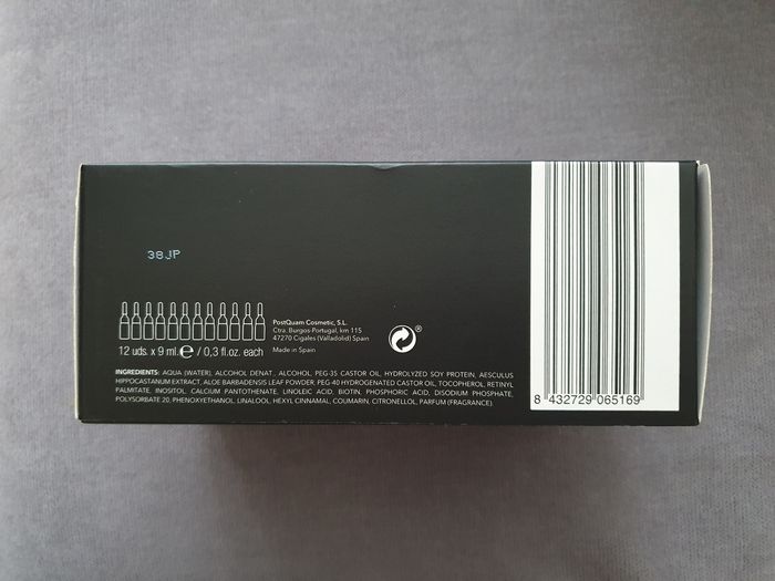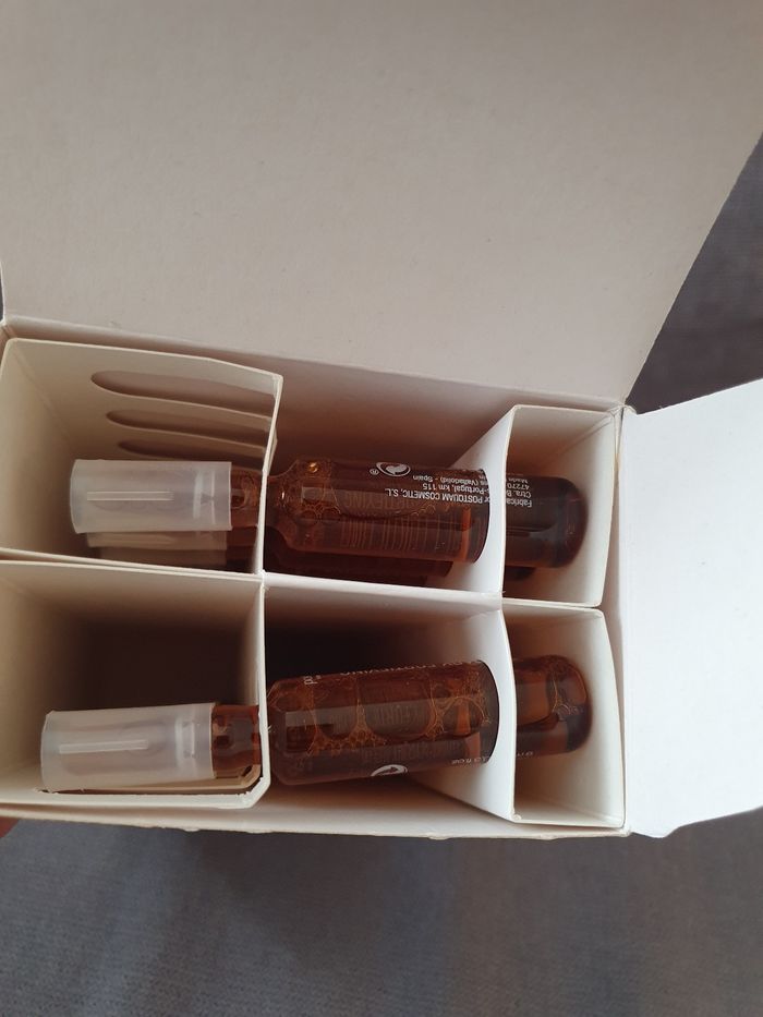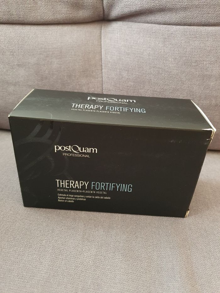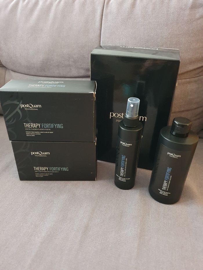 Coffret PostQuam composé de : - Deux boîtes de 12 ampoules de 9 ml chacune (soit 24 ampoules au total), thérapie fortifiante et anti-chute de cheveux - Une lotion pour cheveux de 200 ml - Un shampoing fortifiant de 400 ml Neuf, jamais utilisé.